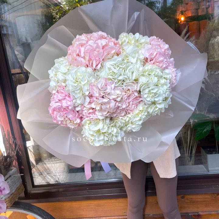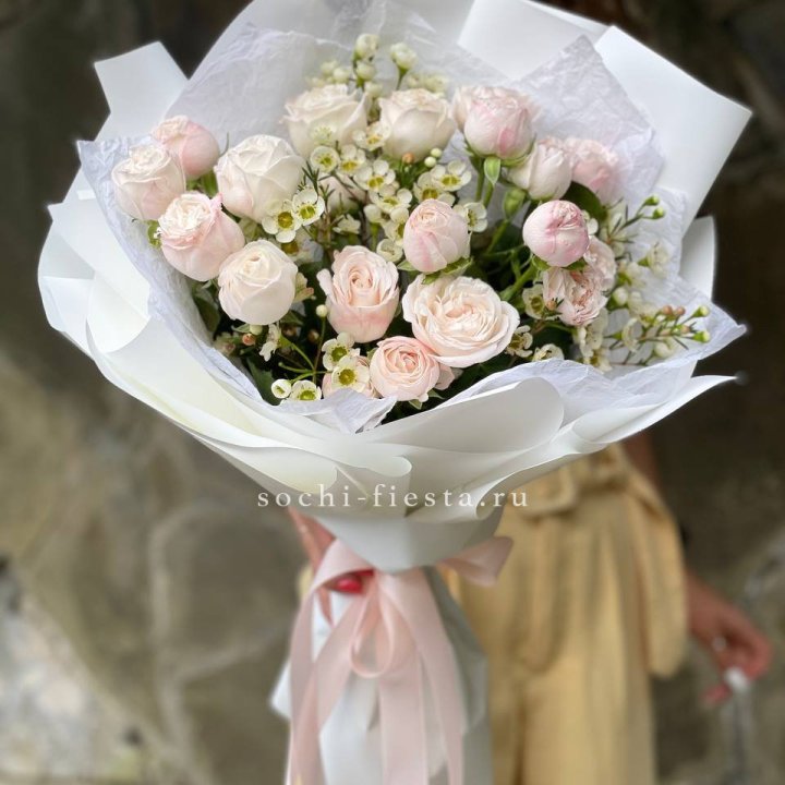 В сезон (весна и лето) ассортимент шире: пионы, ранункулюсы, тюльпаны местные и голландские, ромашки, гортензия. Круглый год — розы от 50 см стебель, кустовые хризантемы, альстромерия, гипсофила, эустома, гвоздики, эвкалипт для миксов.