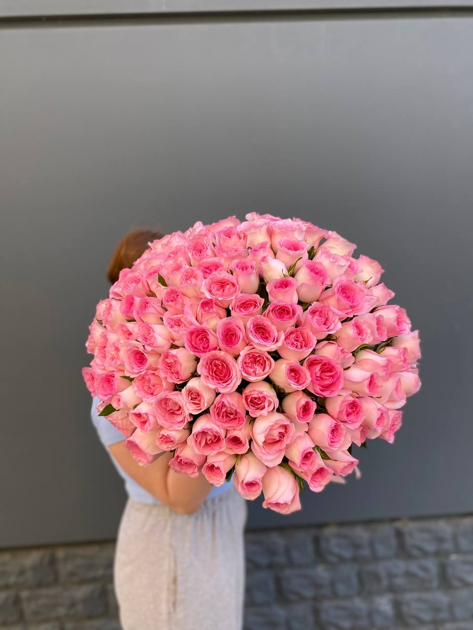 Сто один бутон кенийского пионовидного сорта собраны в масштабную композицию. Белая окантовка лепестков переходит в розовый центр. Впечатляющее присутствие в любом пространстве.