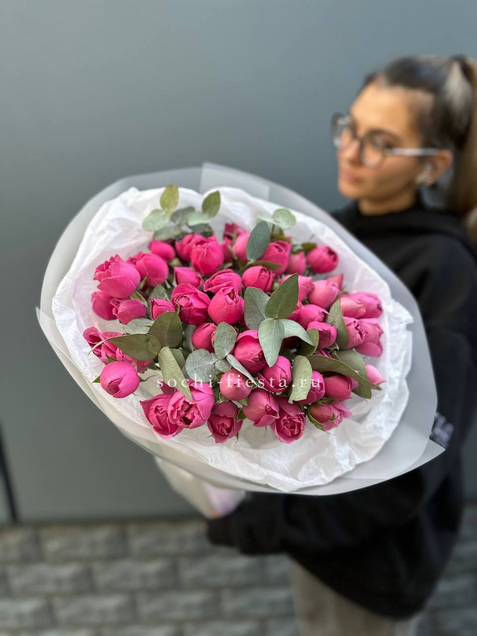 Пятьдесят пять бутонов собраны в плотную округлую форму, где каждый цветок читается отдельно. Красный здесь звучит насыщенно и глубоко, создавая мощное визуальное присутствие. Букет держит форму и занимает пространство уверенно.