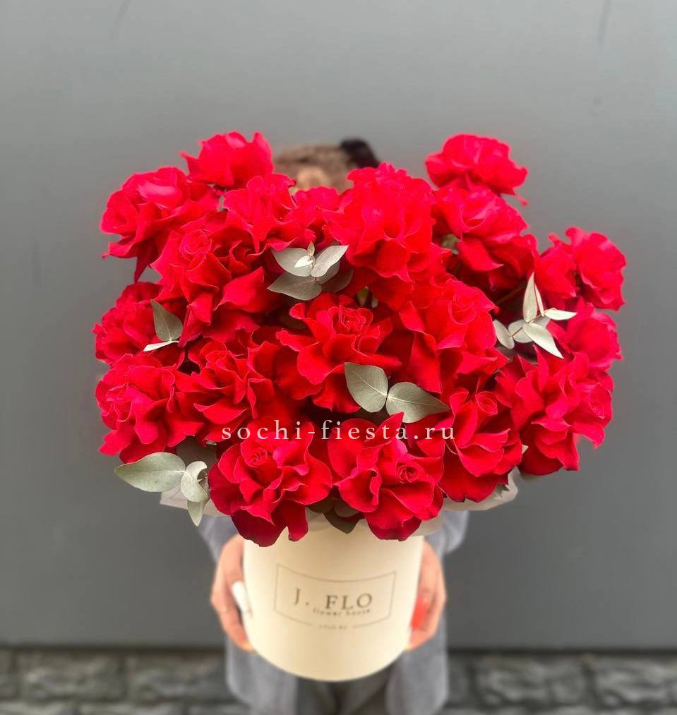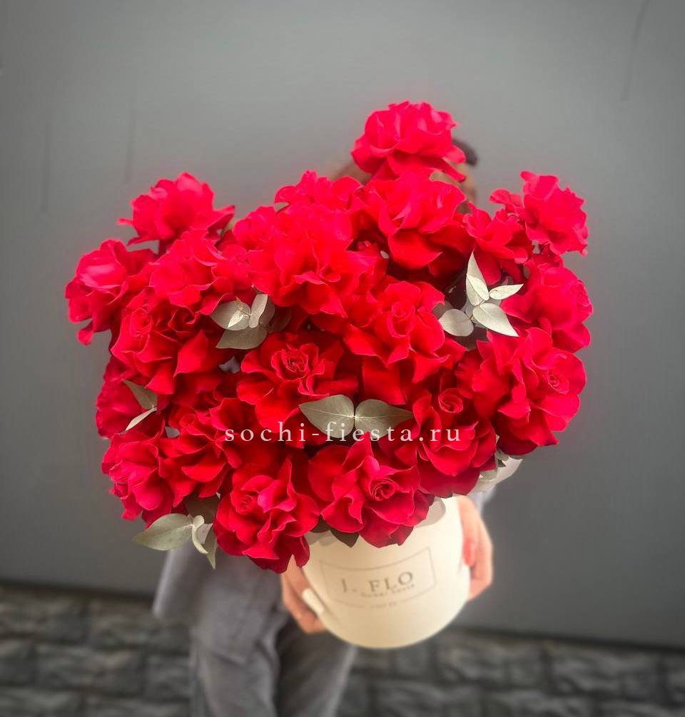 Вывернутые розы раскрывают пышную внутреннюю структуру лепестков и задают фактурный ритм композиции. Гортензия и диантусы дополняют объём воздушными соцветиями в лаконичном боксе.
