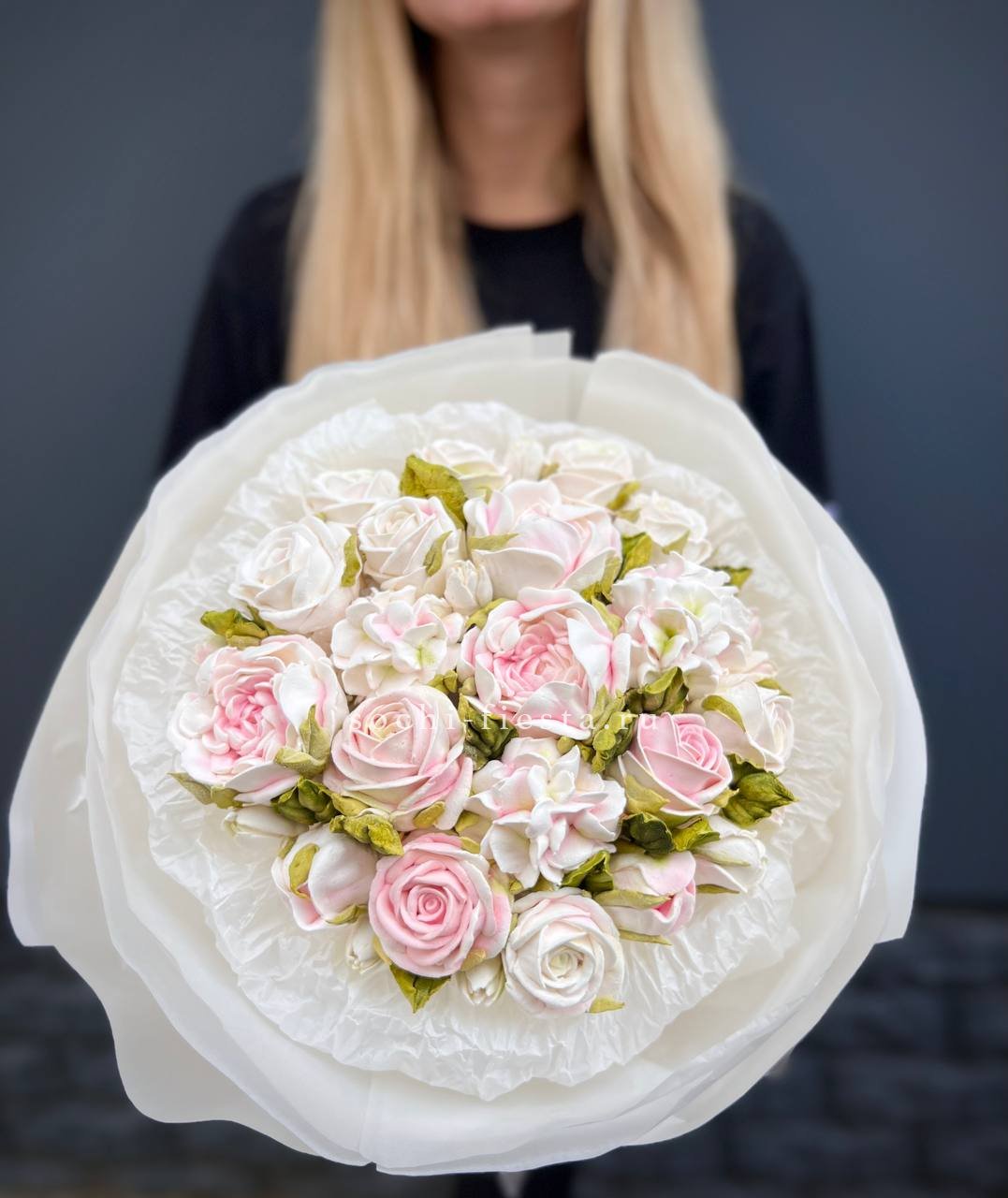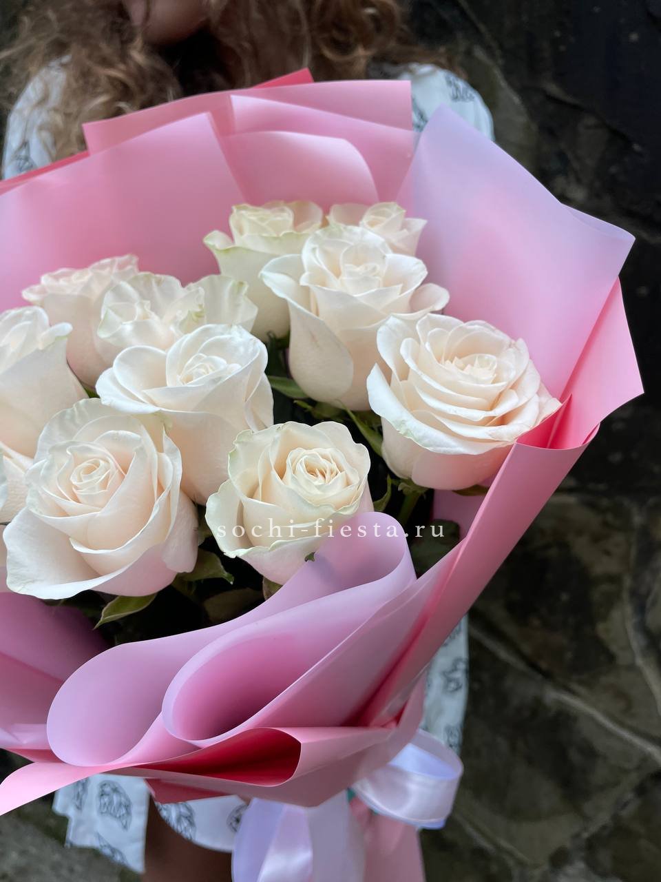 Белоснежные бутоны собраны в лаконичную форму с воздушной текстурой упаковки. Чистота линий и свежесть делают композицию универсальной для любого момента.