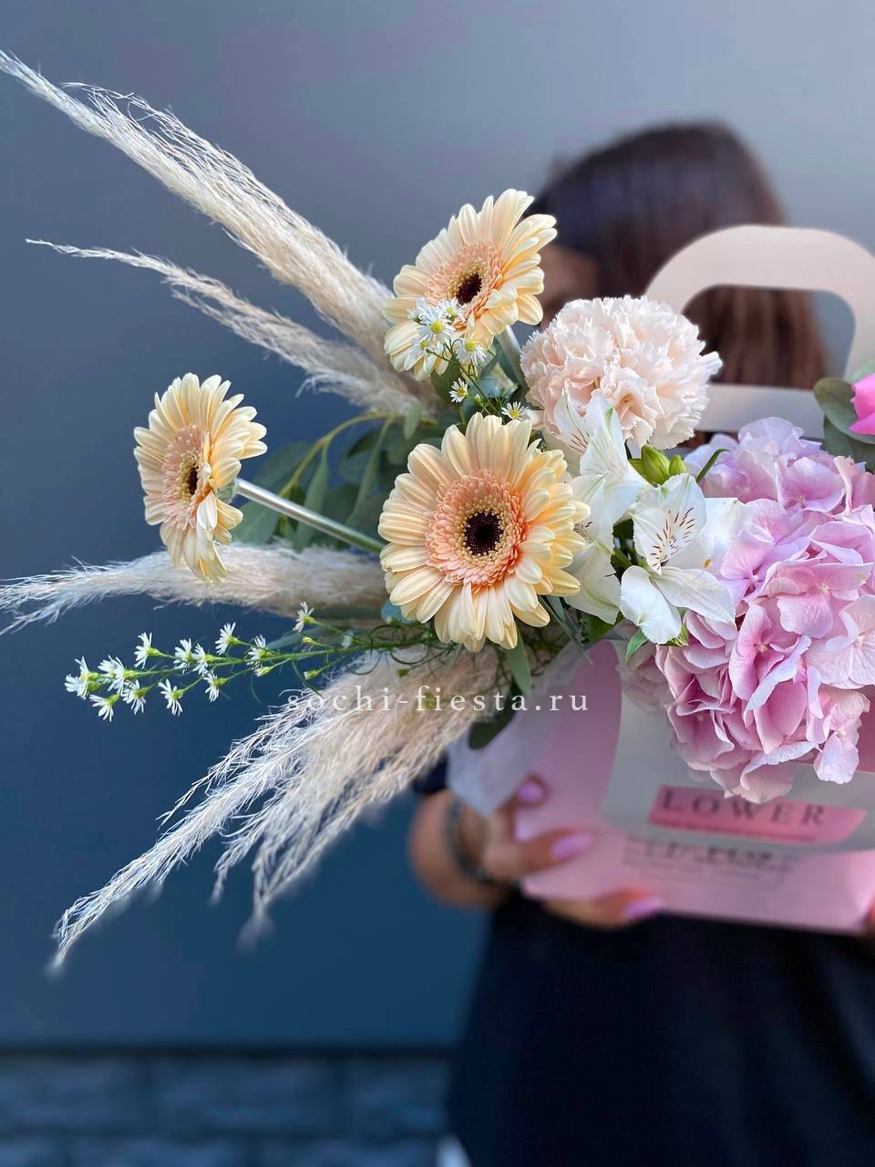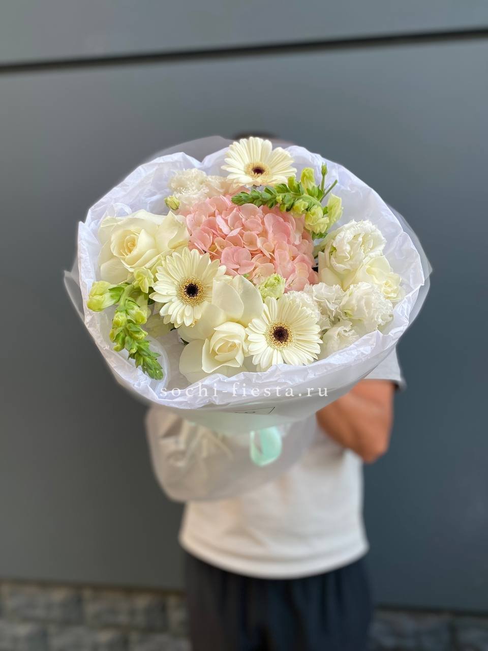 Многослойная композиция с герберами, эустомой и гортензией образует плавные переходы оттенков. Антиринум вытягивает силуэт вверх, придавая букету лёгкость и воздушность.