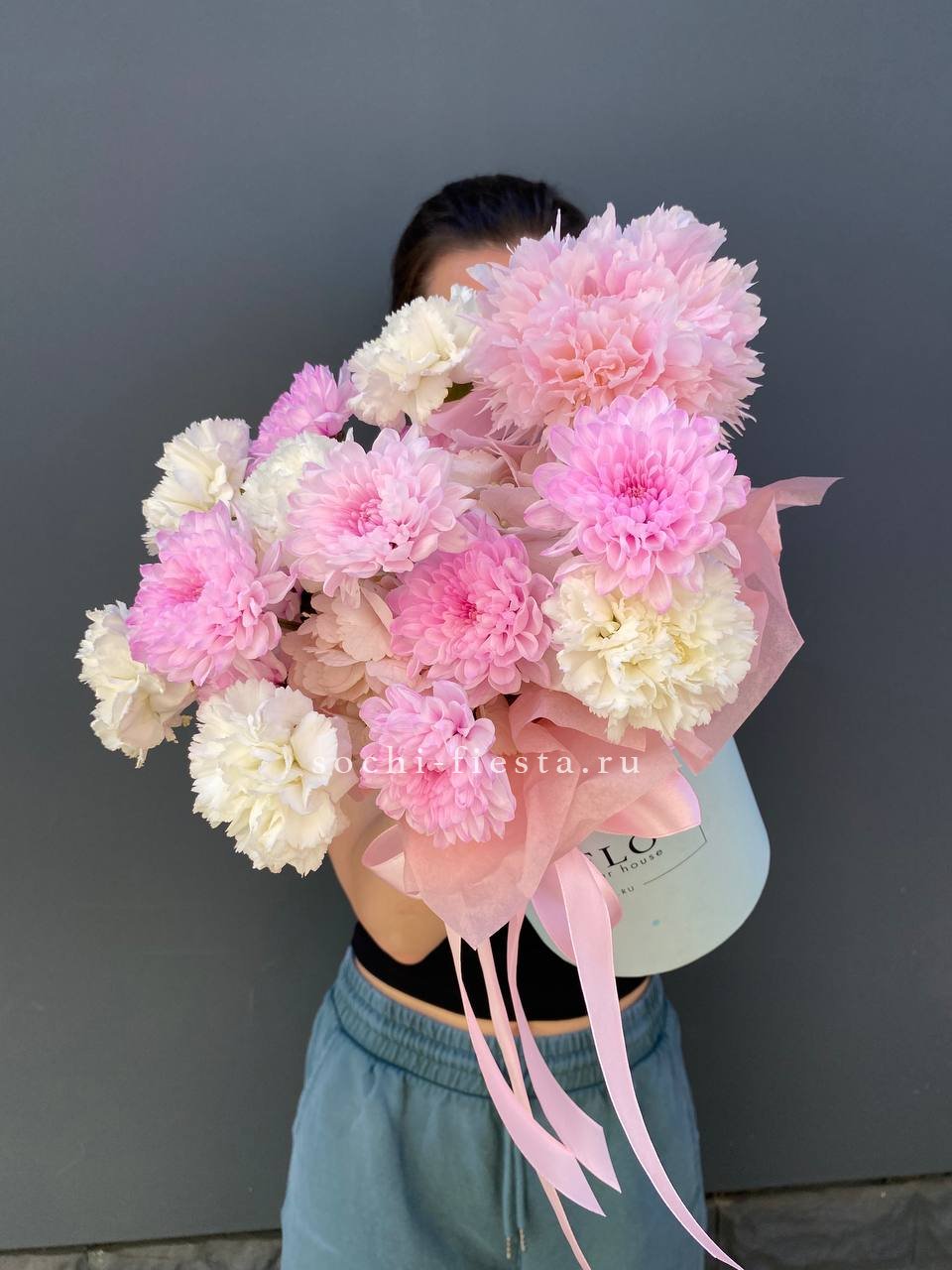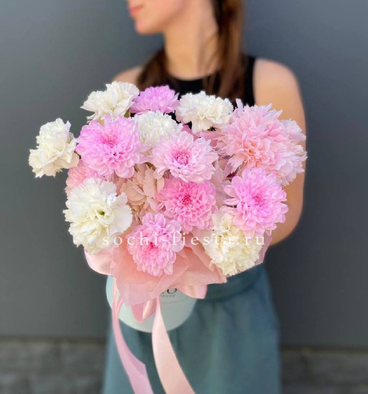хризантемы кустовая, геребры, диантусы, пионовидные розы Мисти Бабблс, эвкалипт,  лента, упаковка.