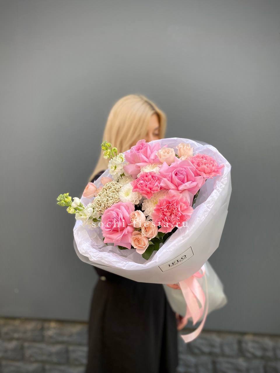 букет из нежных стойких цветов диантусов, роз, хризантем, маттиолы(возможна замена на эустому), озатамуса, бомбастика в воздушном оформлении.