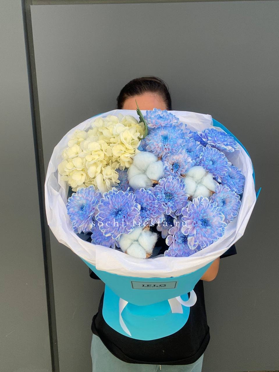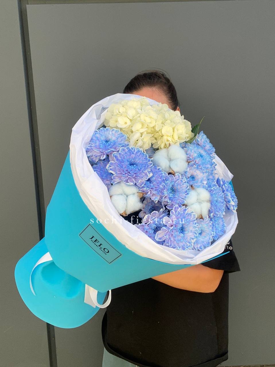 Асимметричная форма напоминает изгиб полумесяца: кустовая хризантема и гортензия собраны в плавную линию. Коробочки хлопка смягчают силуэт и добавляют фактурности краям букета.