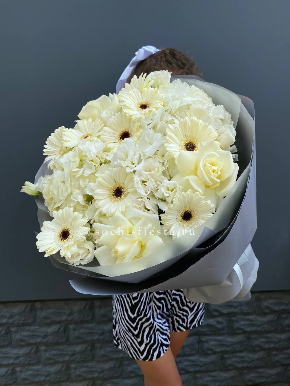 Белые розы, герберы и соцветия гортензии образуют плотную композицию с чёткими линиями. Эустома добавляет воздуха между крупными бутонами, а дизайнерская упаковка завершает форму.
