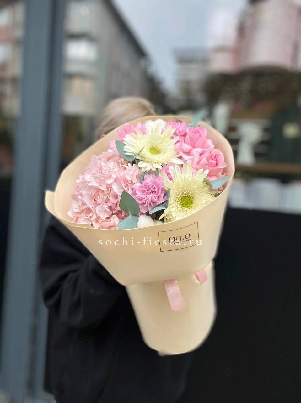 гортензия, герберы, белые розы, эустома,  лента и дизайнерская пленка.