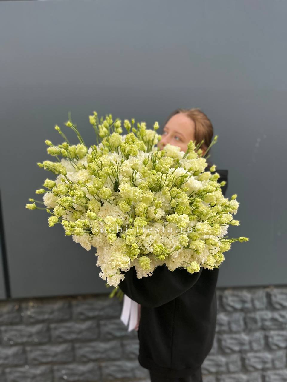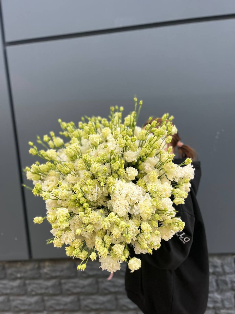 Монохромная композиция из белоснежных эустом в количестве пятидесяти одной штуки. Масштабная сборка впечатляет чистотой линий и графичным присутствием в пространстве.