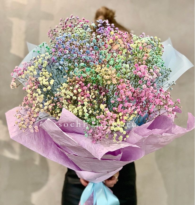 Семь веток гипсофилы окрашены в радужные оттенки и собраны в лёгкую композицию. Многоцветное облако мелких соцветий привносит игривое настроение.