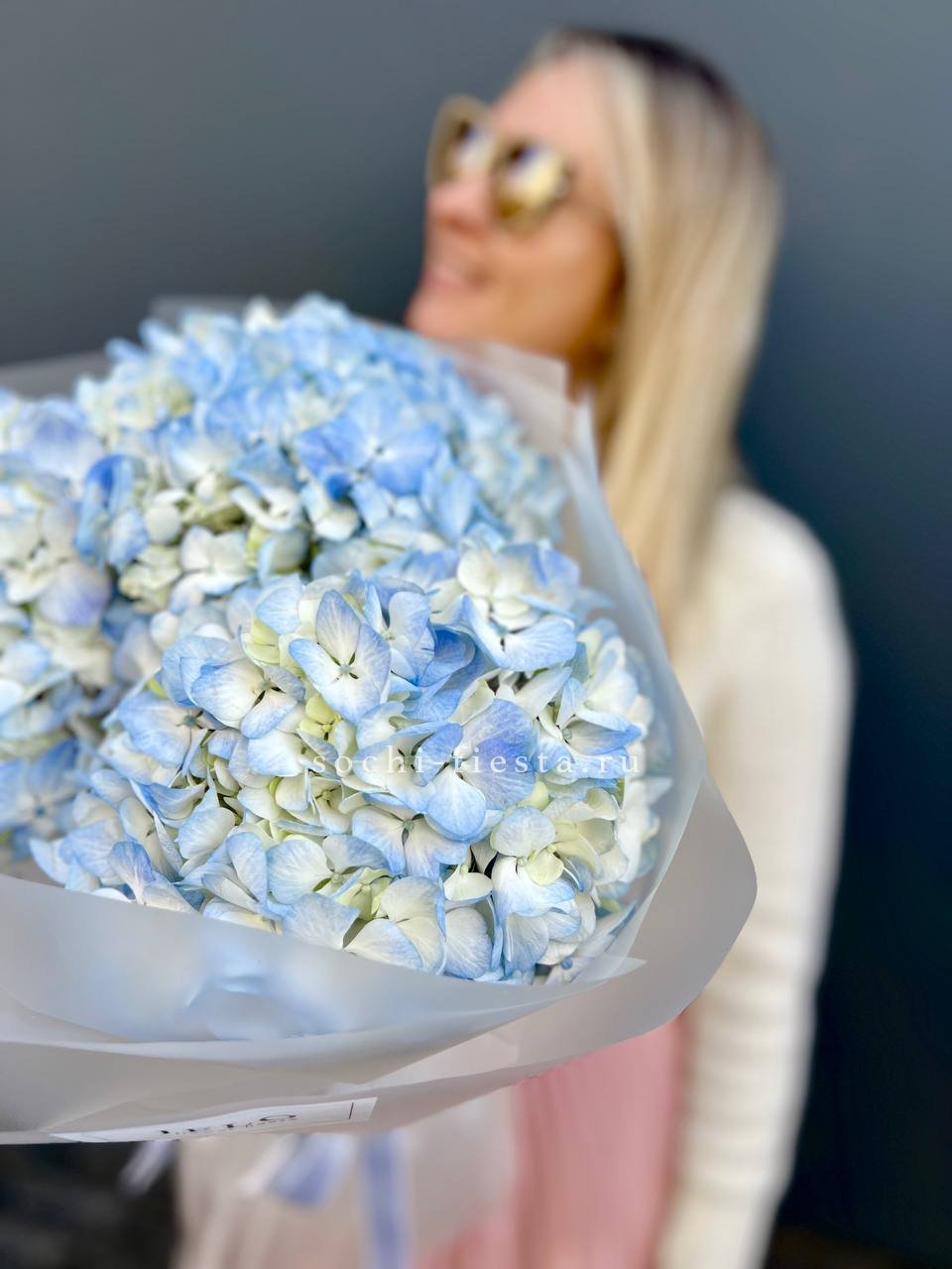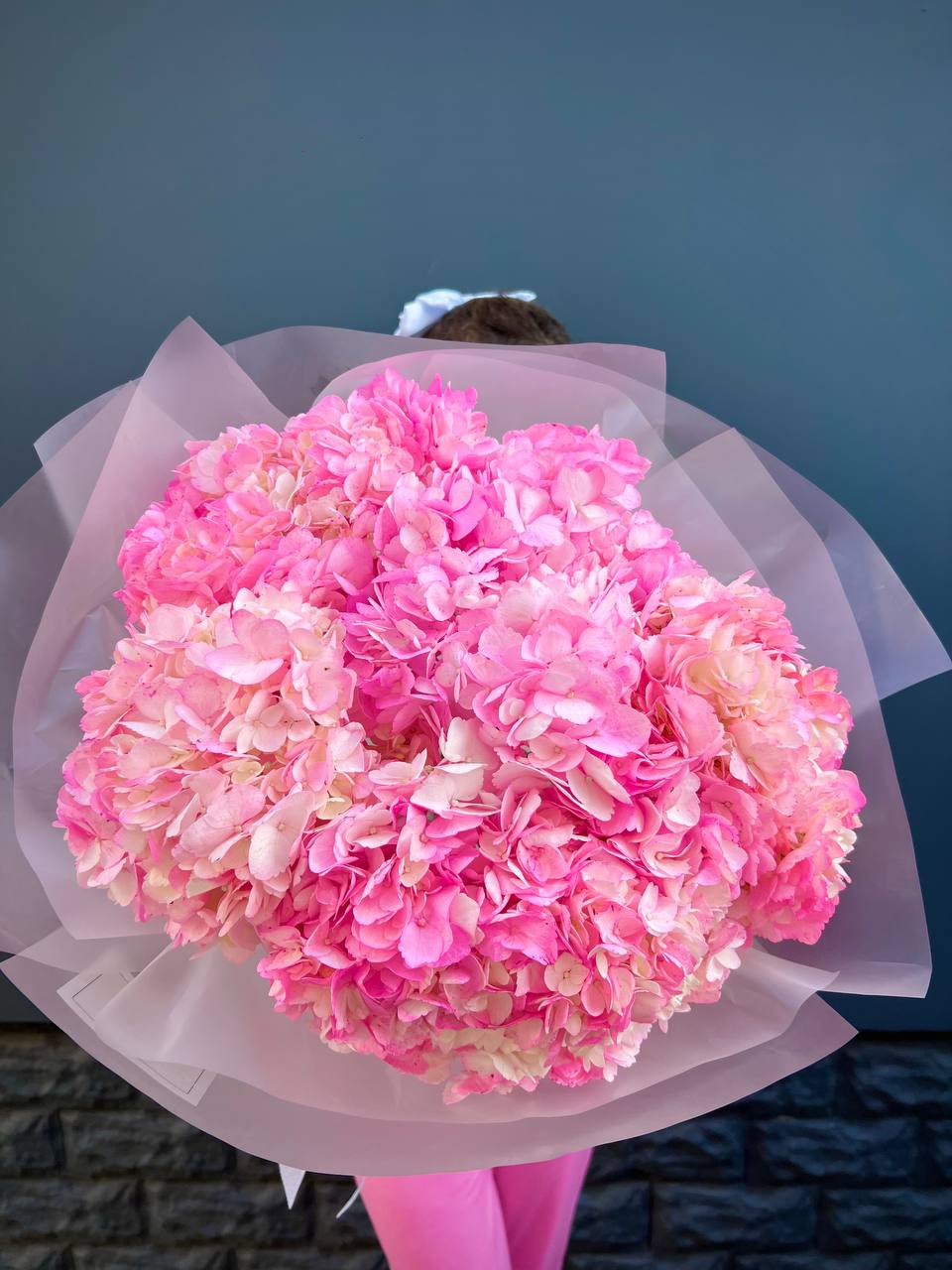 Букет из семи гортензий объединяет разные оттенки в единую композицию с живым ритмом. Переходы цвета создают динамику, а плотные соцветия формируют выразительный объём.