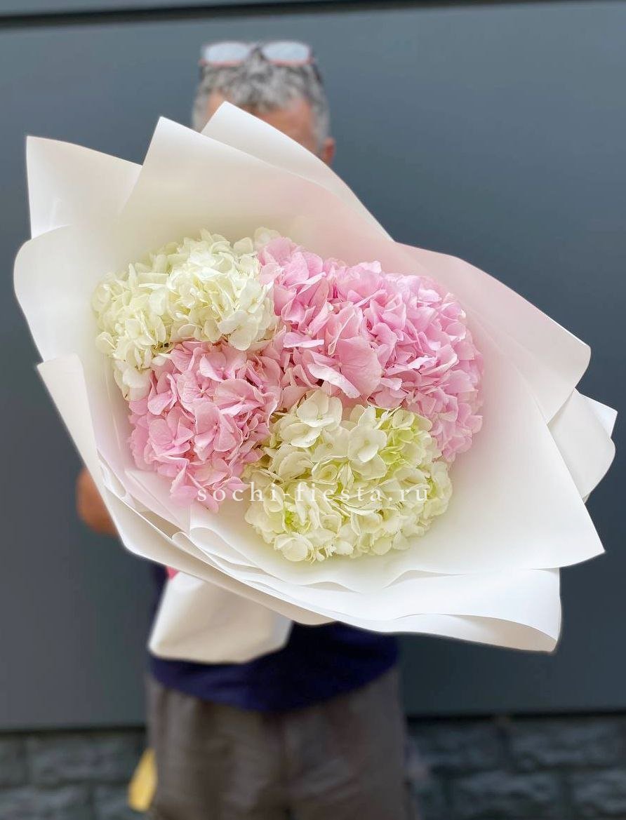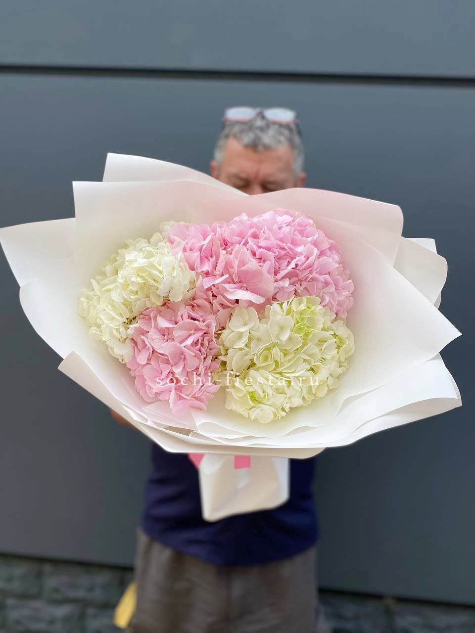 гортензия, эвкалипт, лента, дизайнерская упаковка.