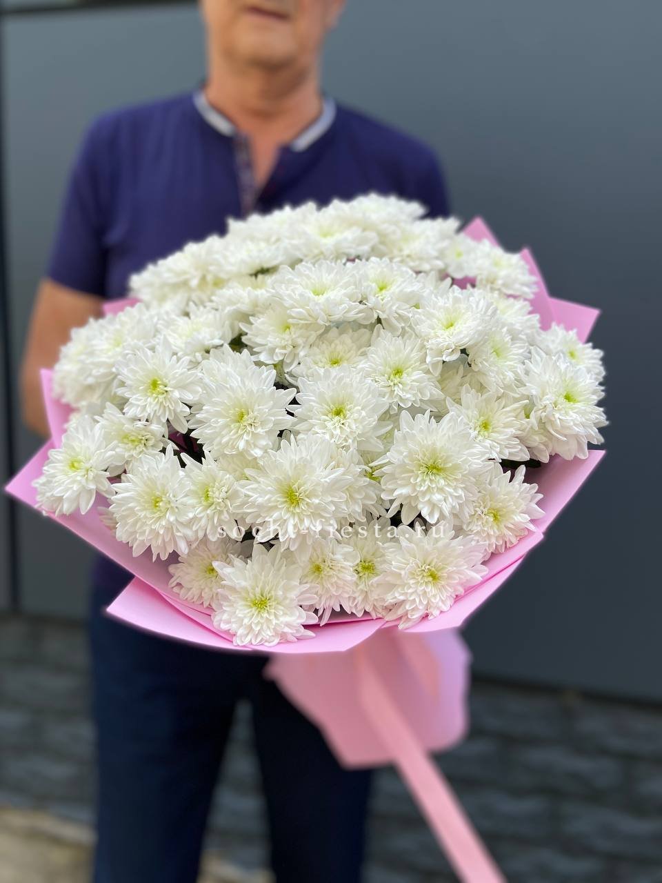 Fifteen веток кустовой хризантемы образуют пышное облако из множества мелких бутонов. Простая упаковка не отвлекает от густоты соцветий и их природной фактуры. Букет долго сохраняет свежесть и объём.