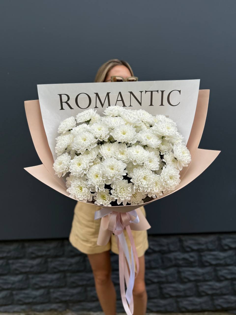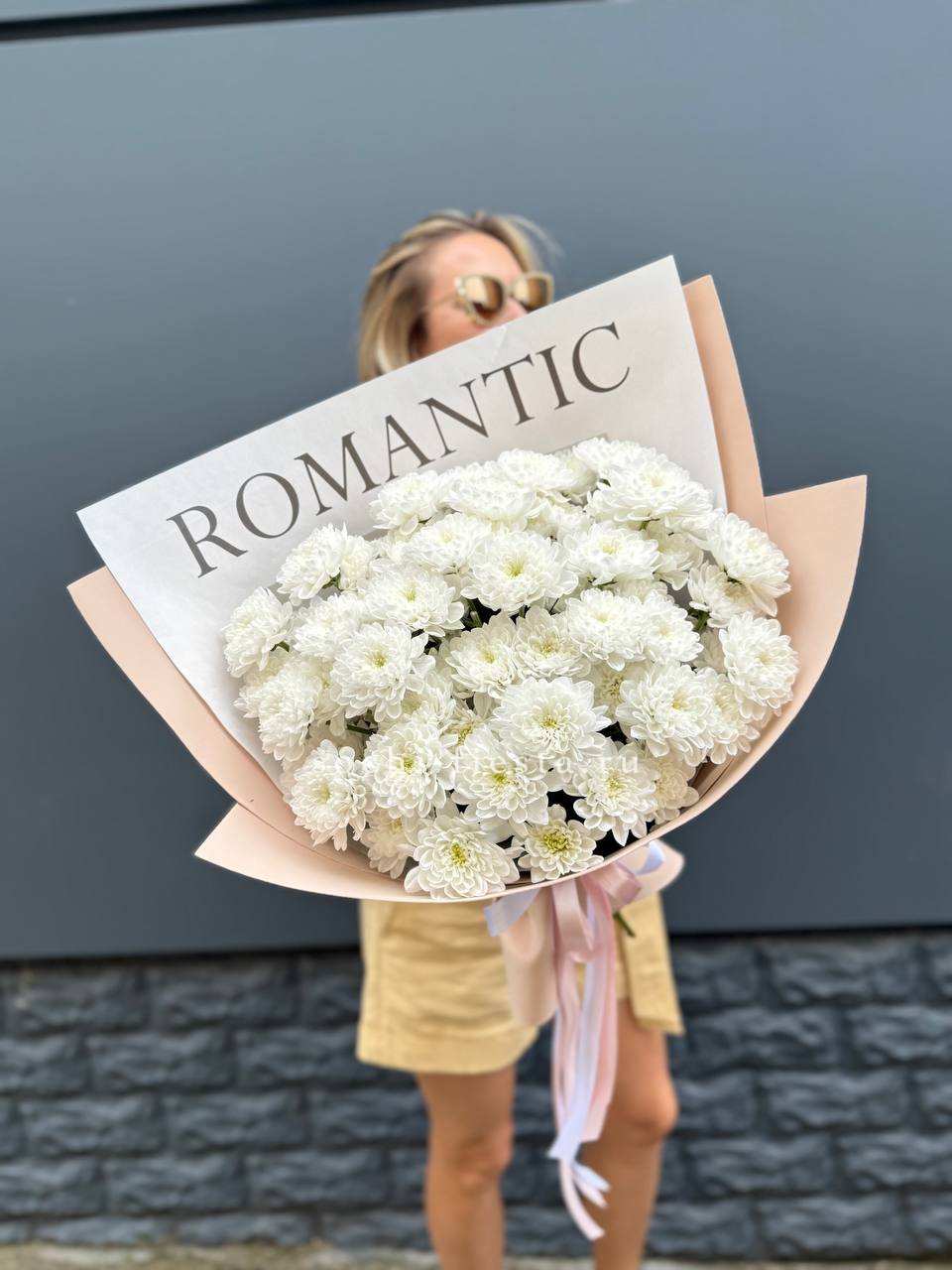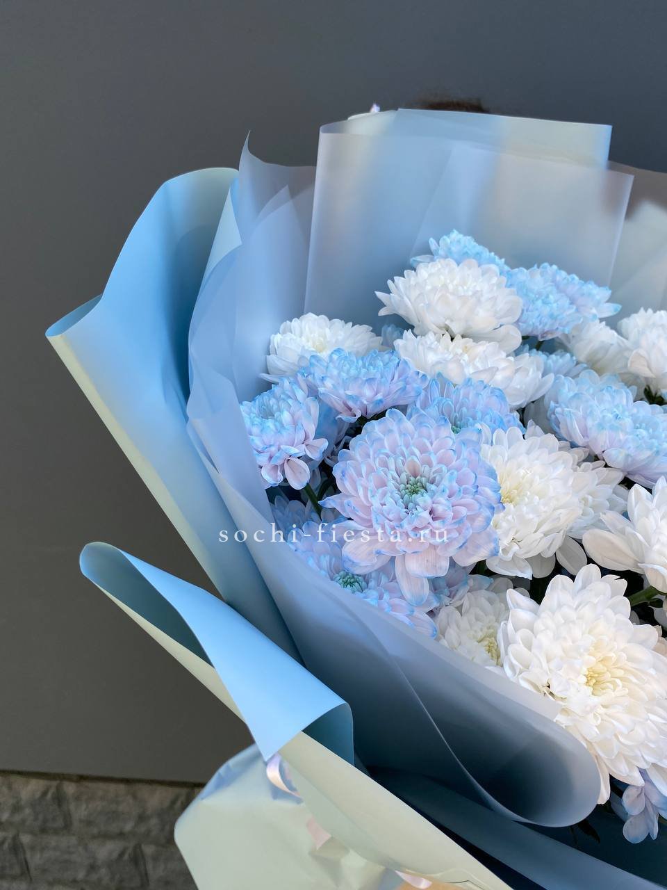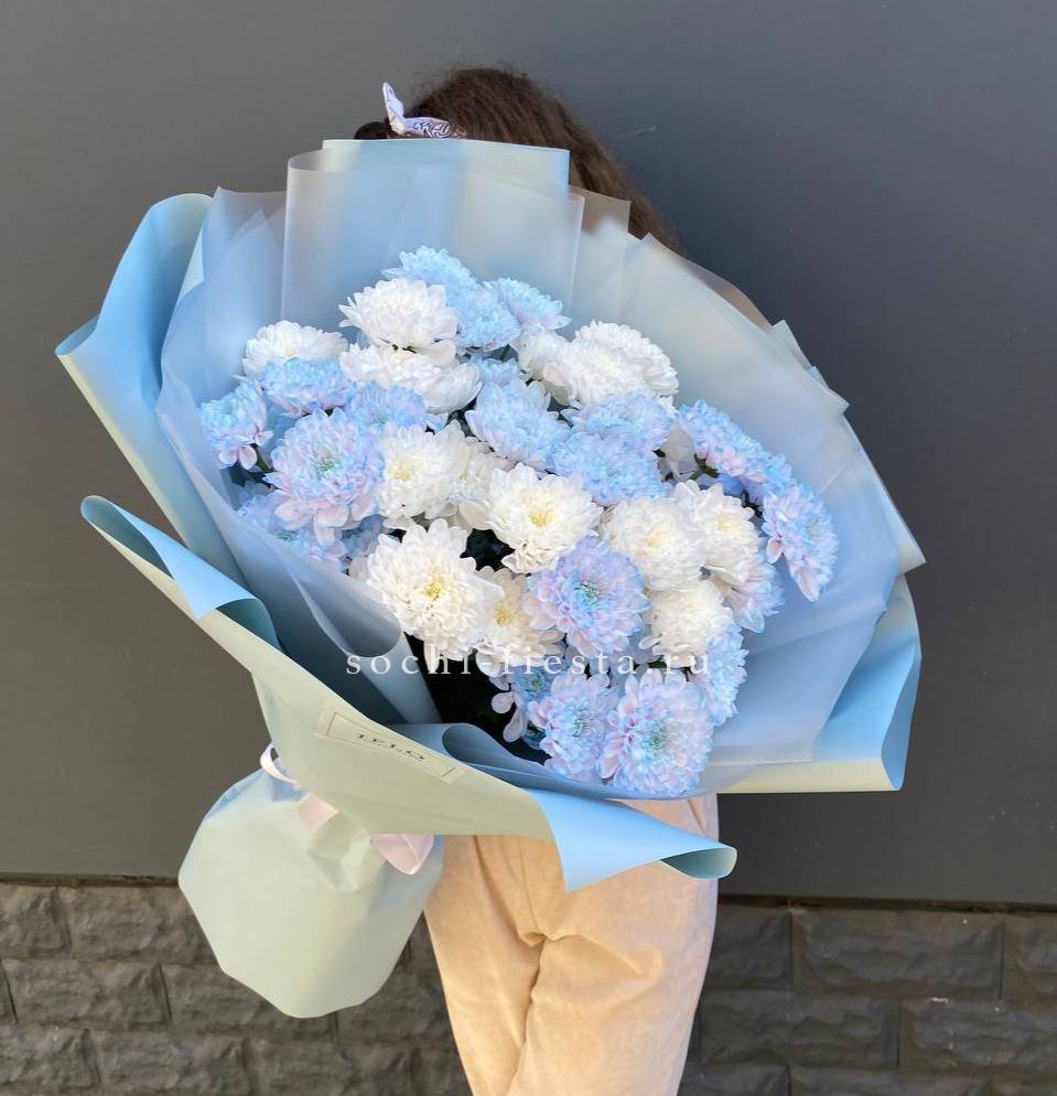 Пятнадцать веток кустовой хризантемы образуют пышное облако из множества соцветий. Каждая ветка раскрывается по-своему, создавая живую текстуру и объёмный силуэт букета.