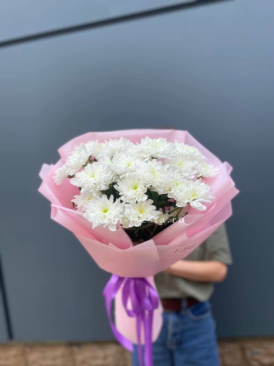 минимальный состав: 7 одноголовых хризантем, лента, упаковка на выбор.