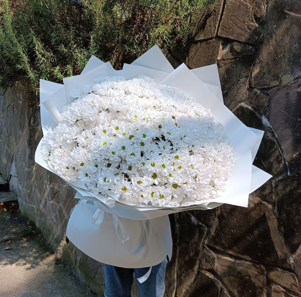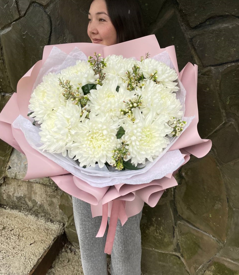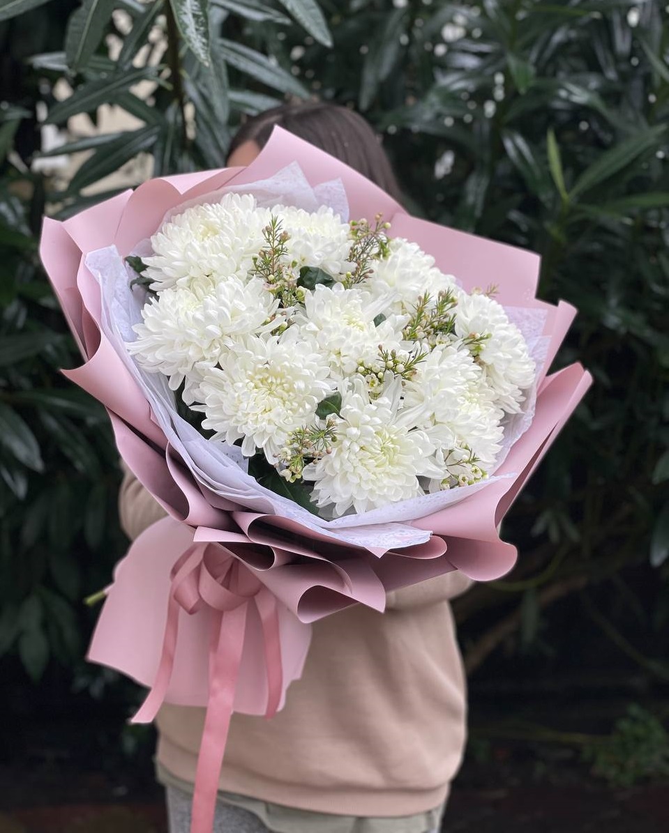 Девять кустовых хризантем сплетаются с пушистыми колосками лагуруса в воздушную композицию. Мягкие текстуры и природная простота создают ощущение прогулки по летнему полю.