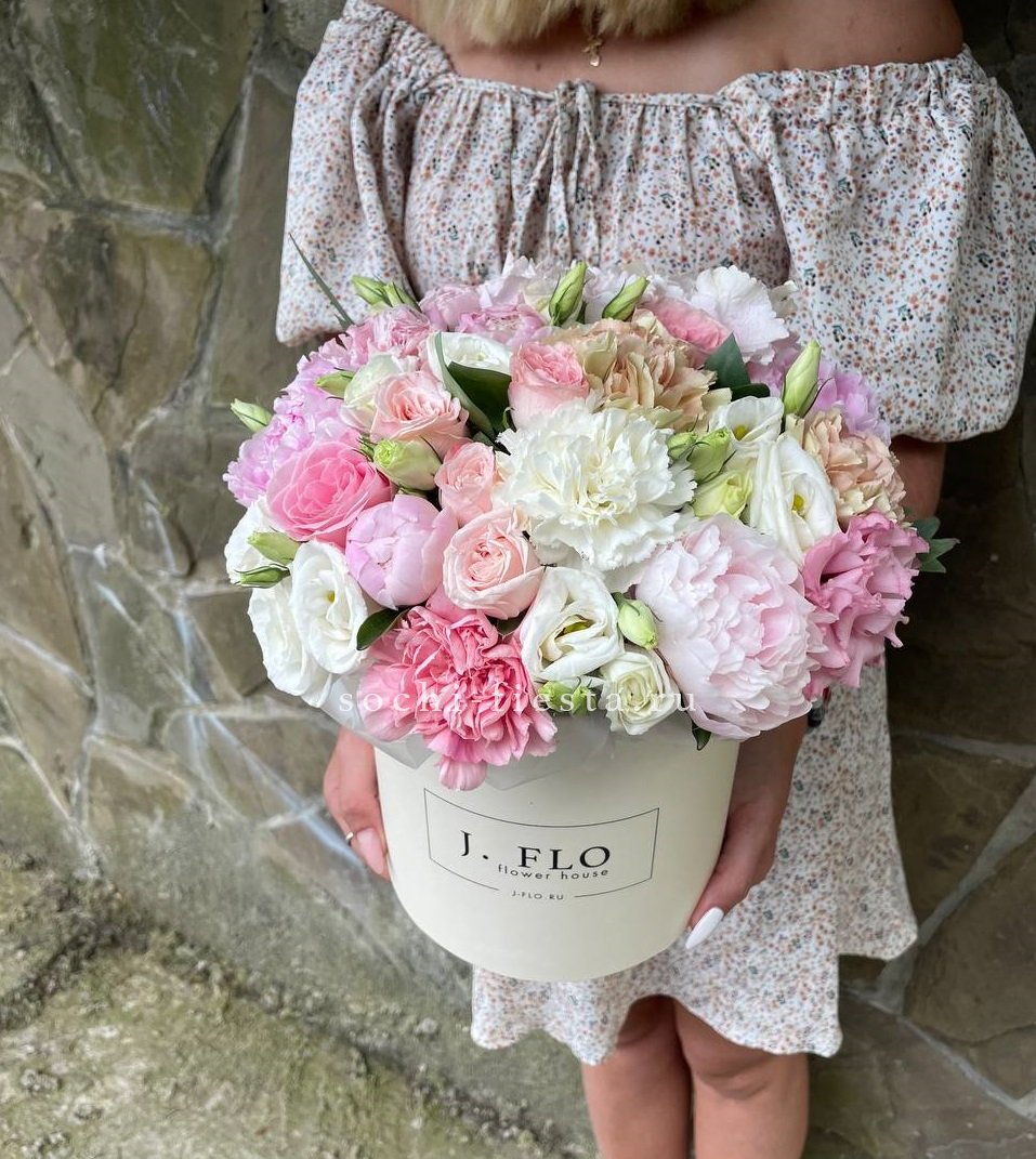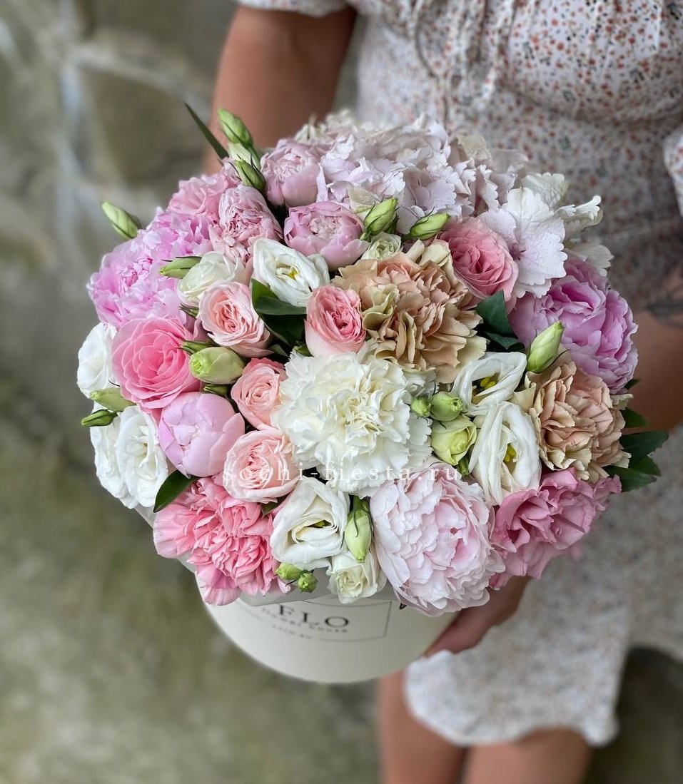 пионовидная роза Мисти Баблс, гортензия, голландские пионы, лента, упаковка.