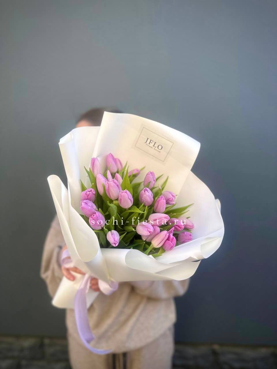 25 сиреневых тюльпанов, лента, оформление.