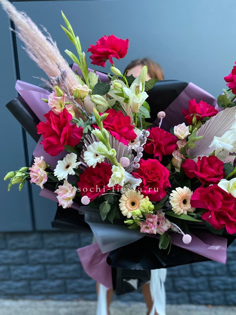 Вертикальные линии гладиолусов и пушистые метёлки пампасной травы задают динамику всей композиции. Красные розы и герберы переплетаются с белоснежными эустомами и лилиями, создавая многослойный объём. Авторская работа для тех, кто ценит выразительность формы.