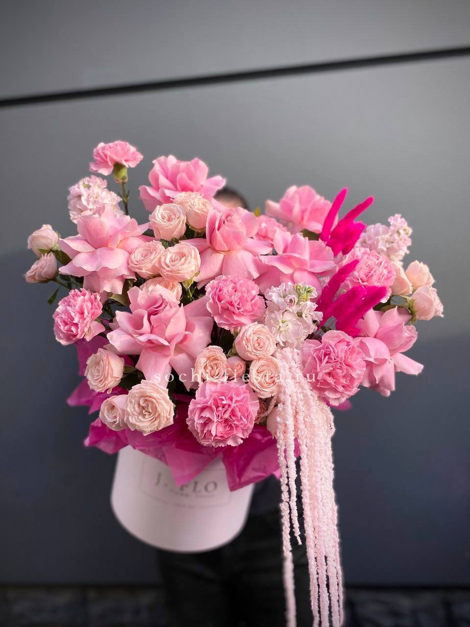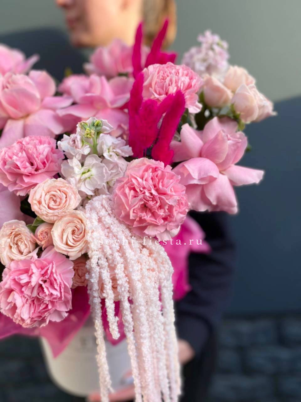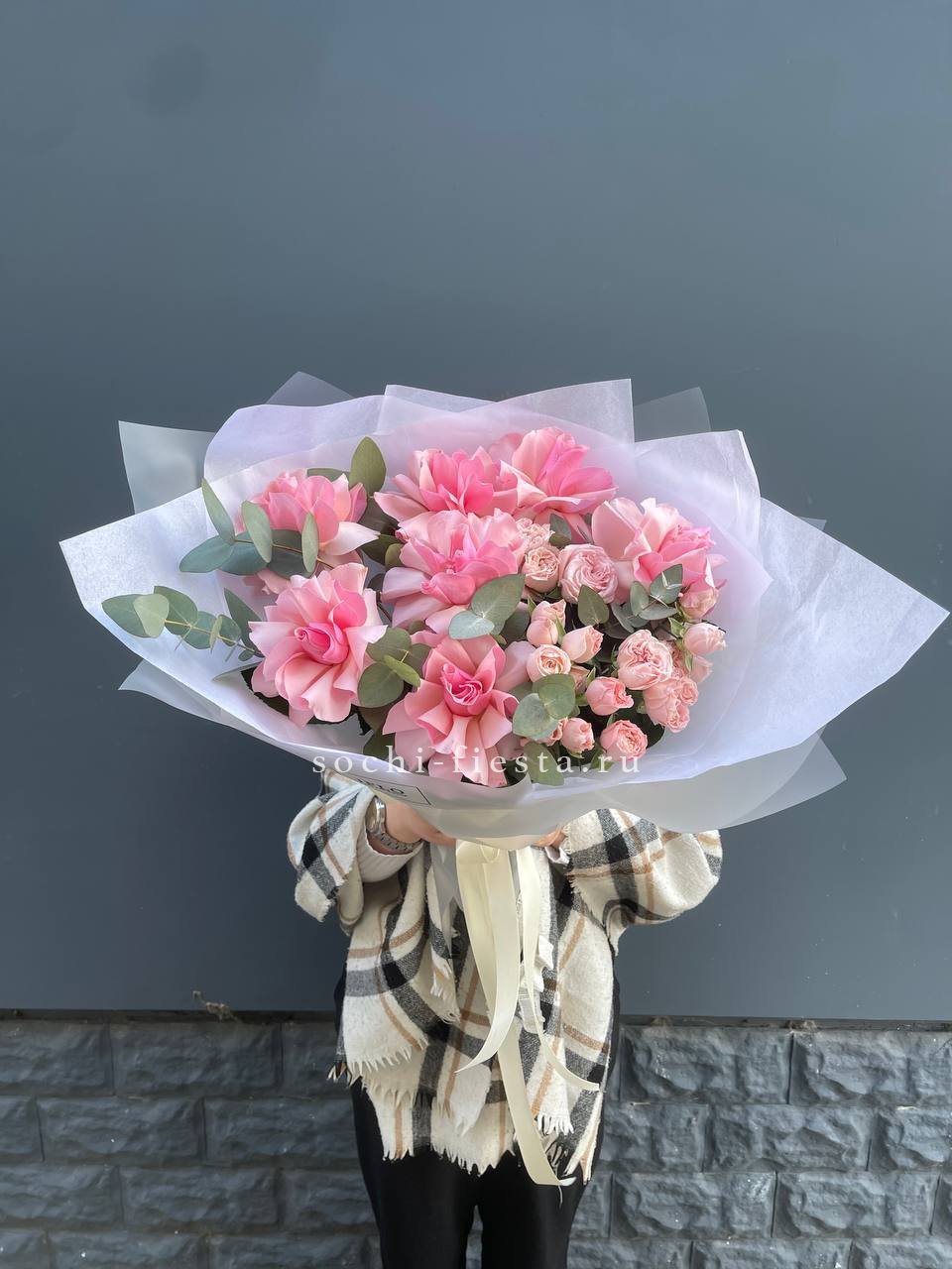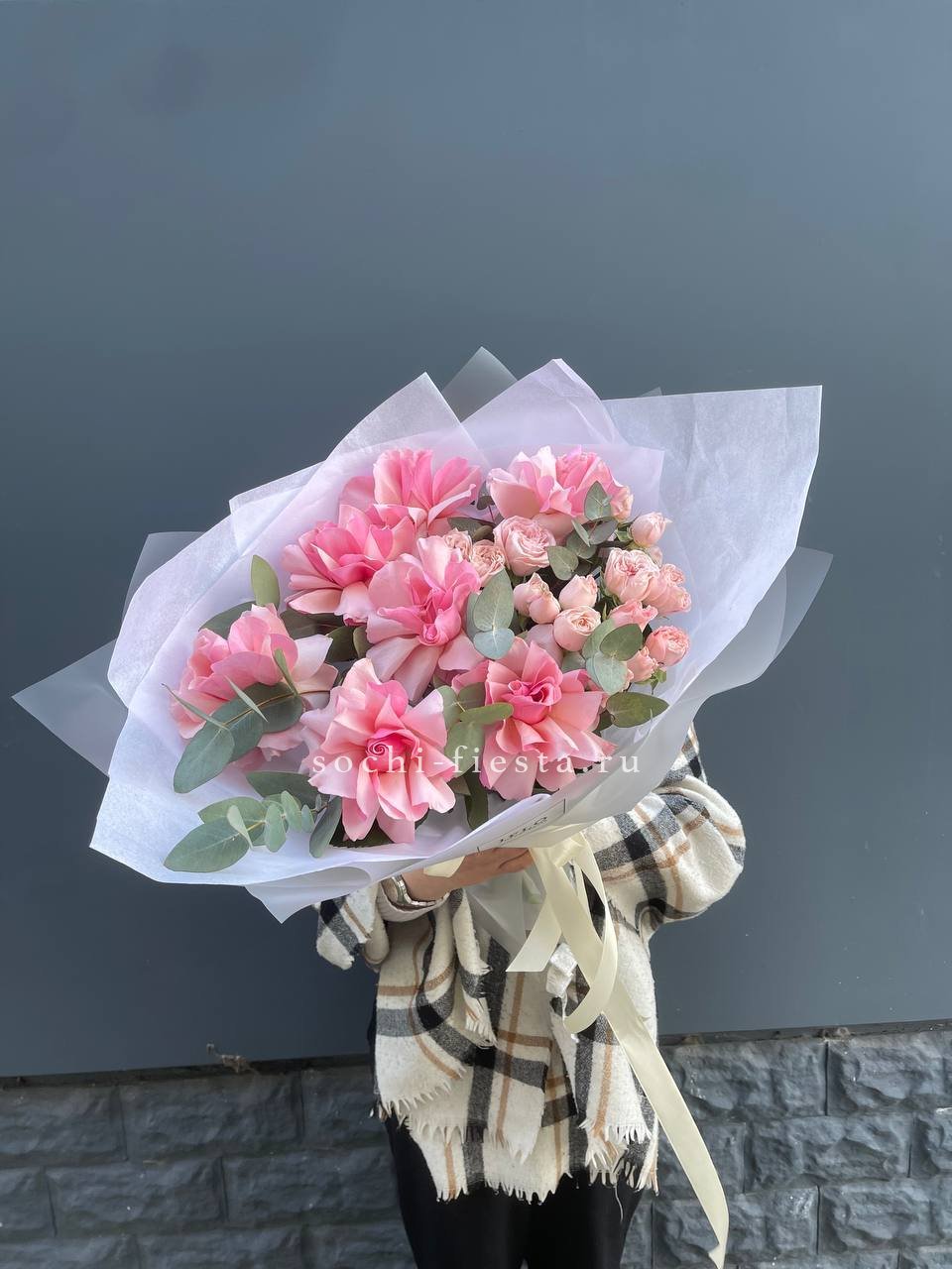 гортензия, диантус, мисти бабблс, астильба или аналог, гербера, кустовая роза, бовардия, эустома, эвкалипт, авторская упаковка, лента.