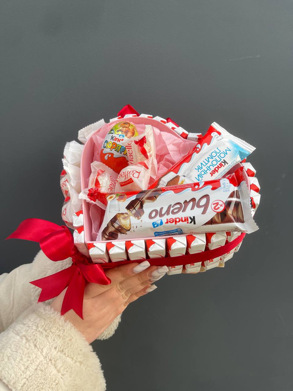 яйцо Kinder- 1шт., Kinder шоколад- 4уп., Kinder Bueno- 1шт., молочный ломтик-1шт., Raffaello-3шт., наполнитель, цилиндрическая коробка.