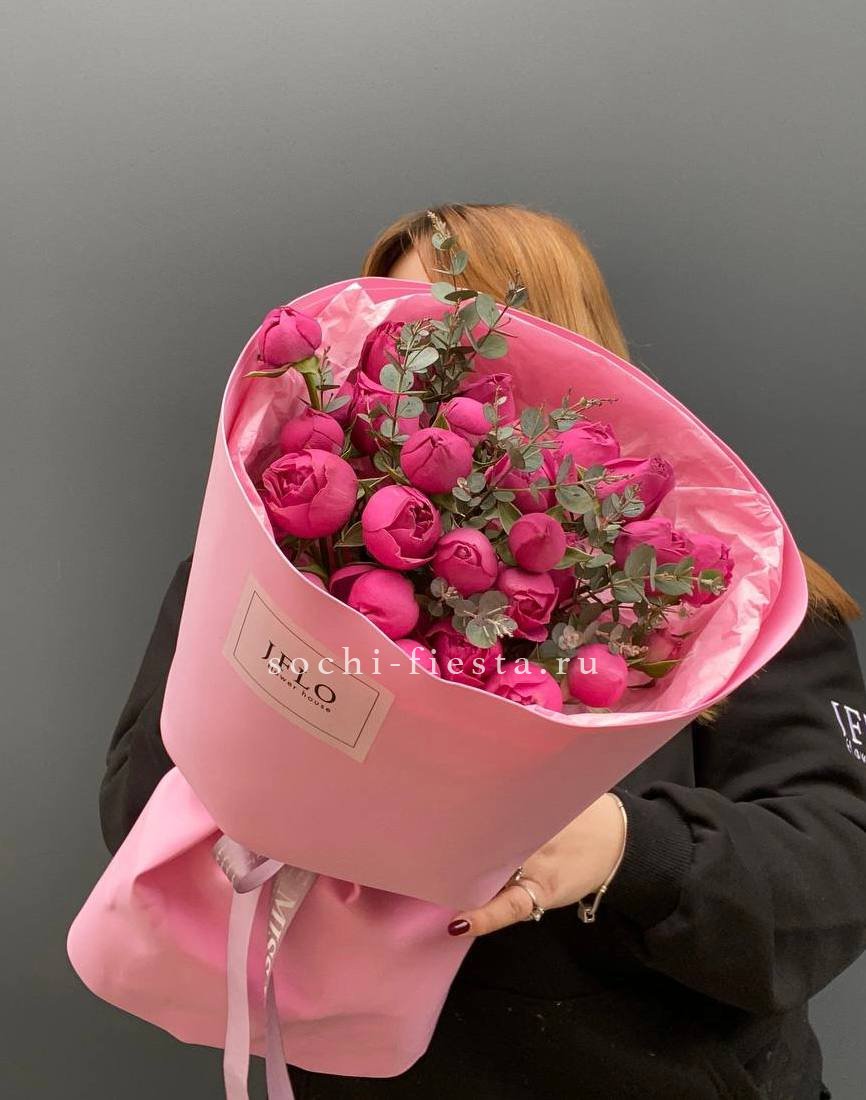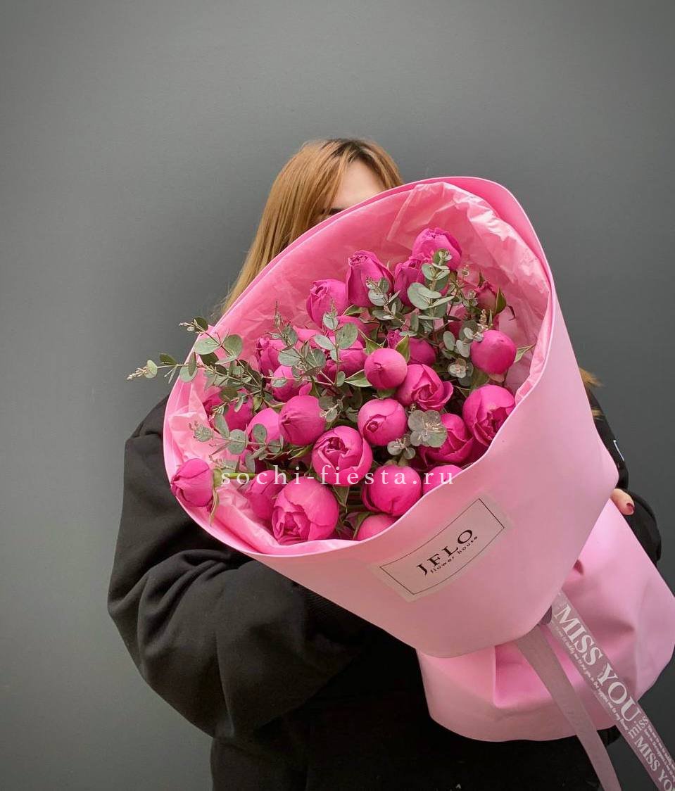 жёлтые тюльпаны, розы, эвкалипт, пленка.