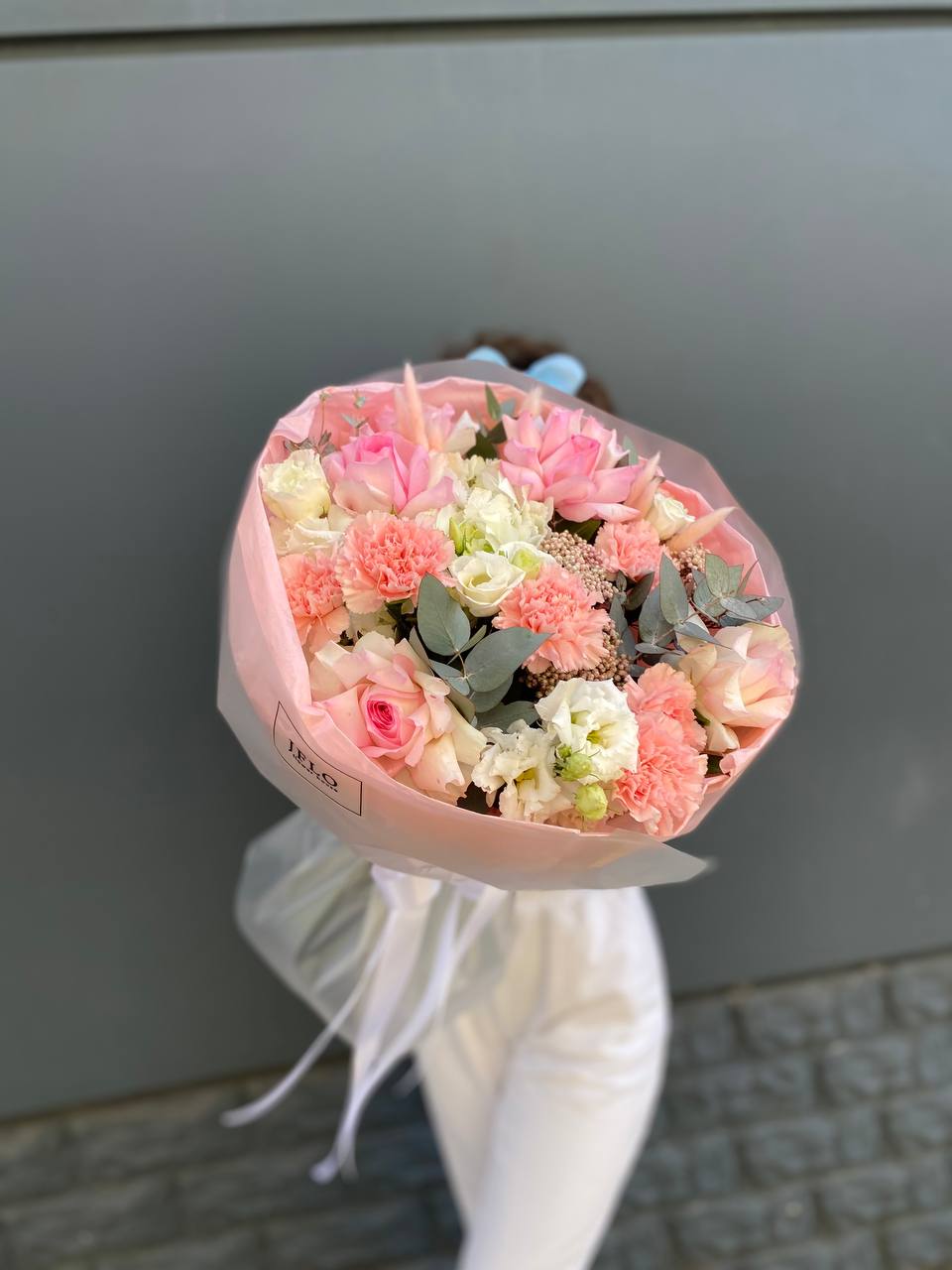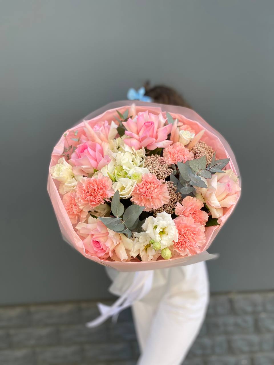 Пионовидные розы соседствуют с классическими, создавая игру объёмов и плотности бутонов. Диантус вплетается между ними легкими штрихами. Эвкалипт добавляет воздуха и завершает силуэт.