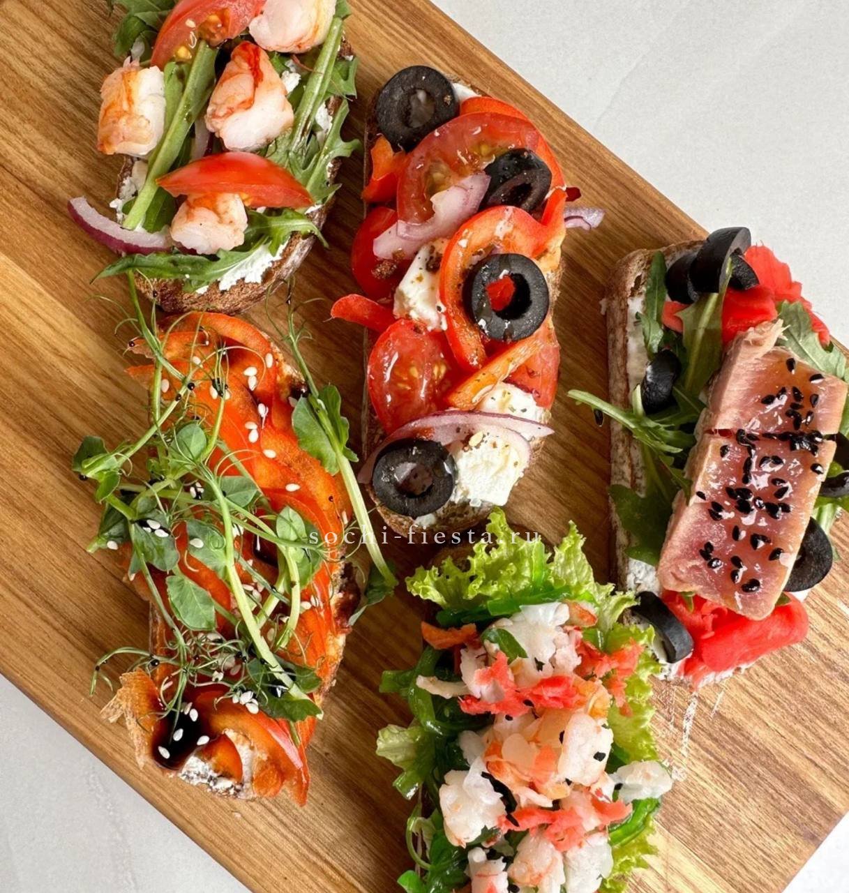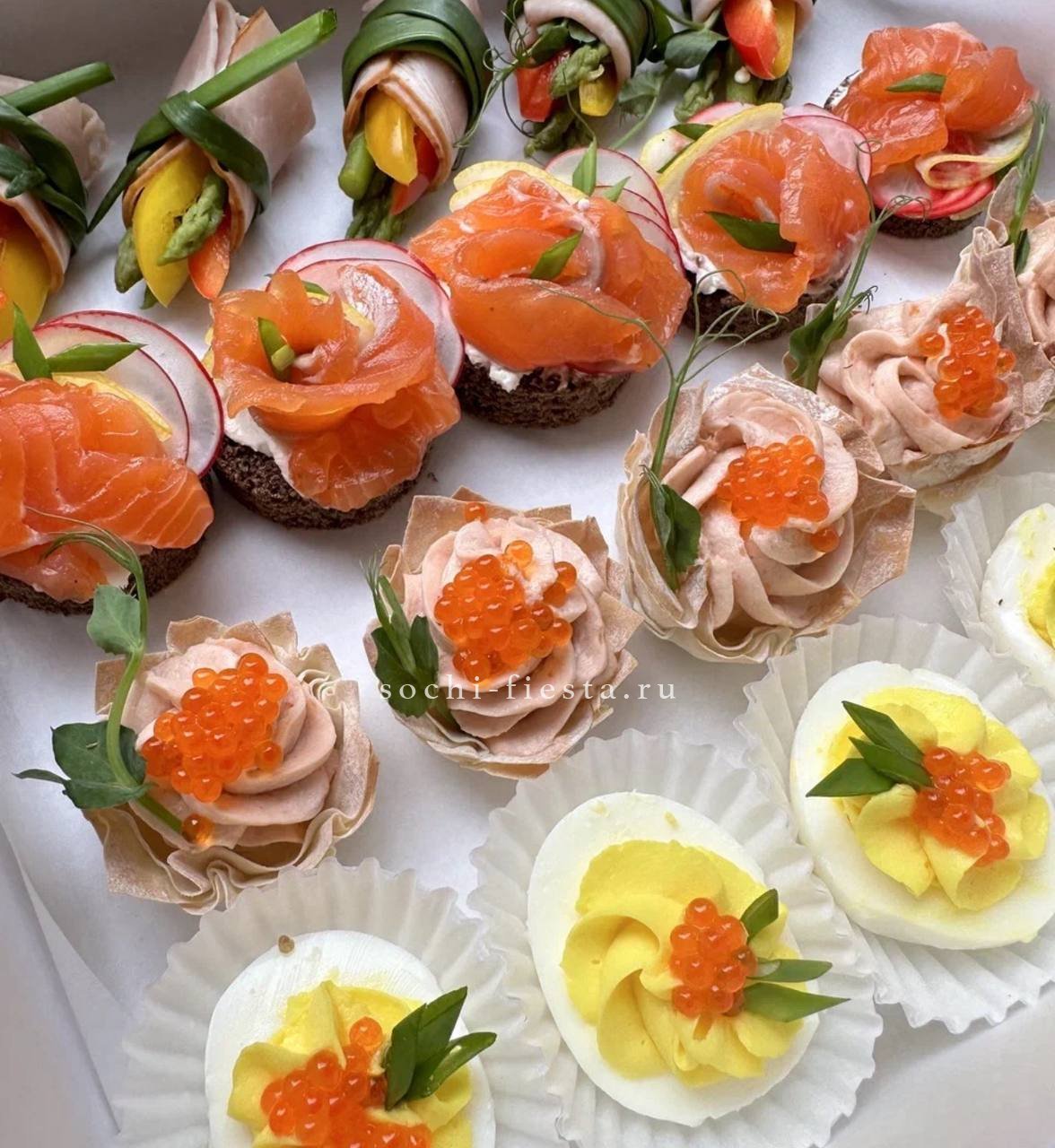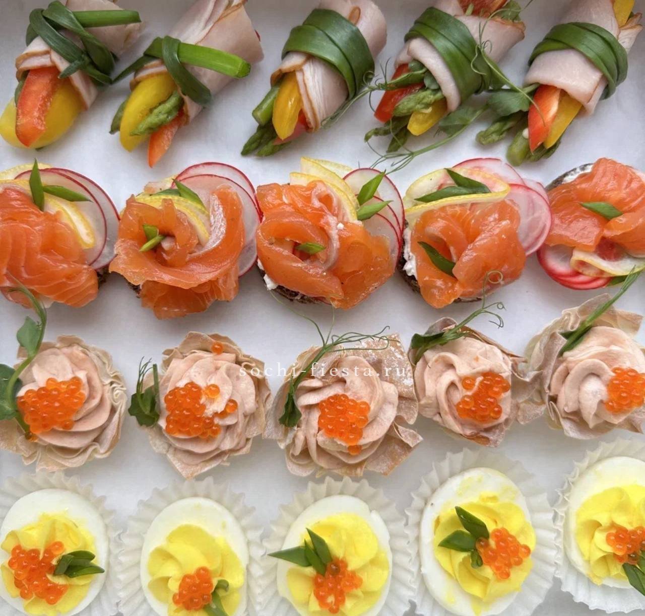 конвертики с овощами и ветчиной- 5 шт. Мини тосты с лососем, редисом и лимоном- 5 шт. Тарталетки с рийетом из лосося- 5 шт. Яйцо в пикантной начинкой из сыра- 5 шт.