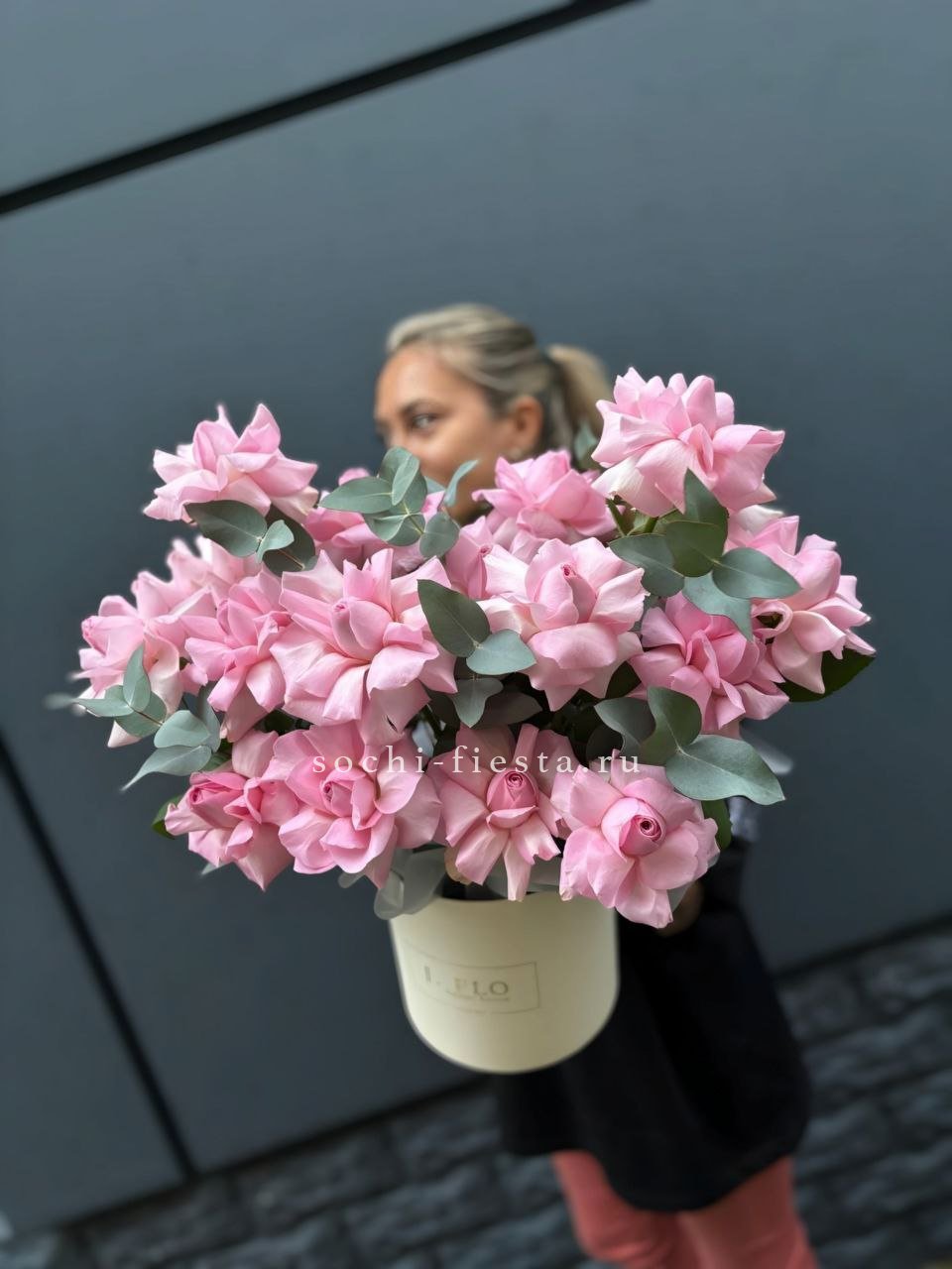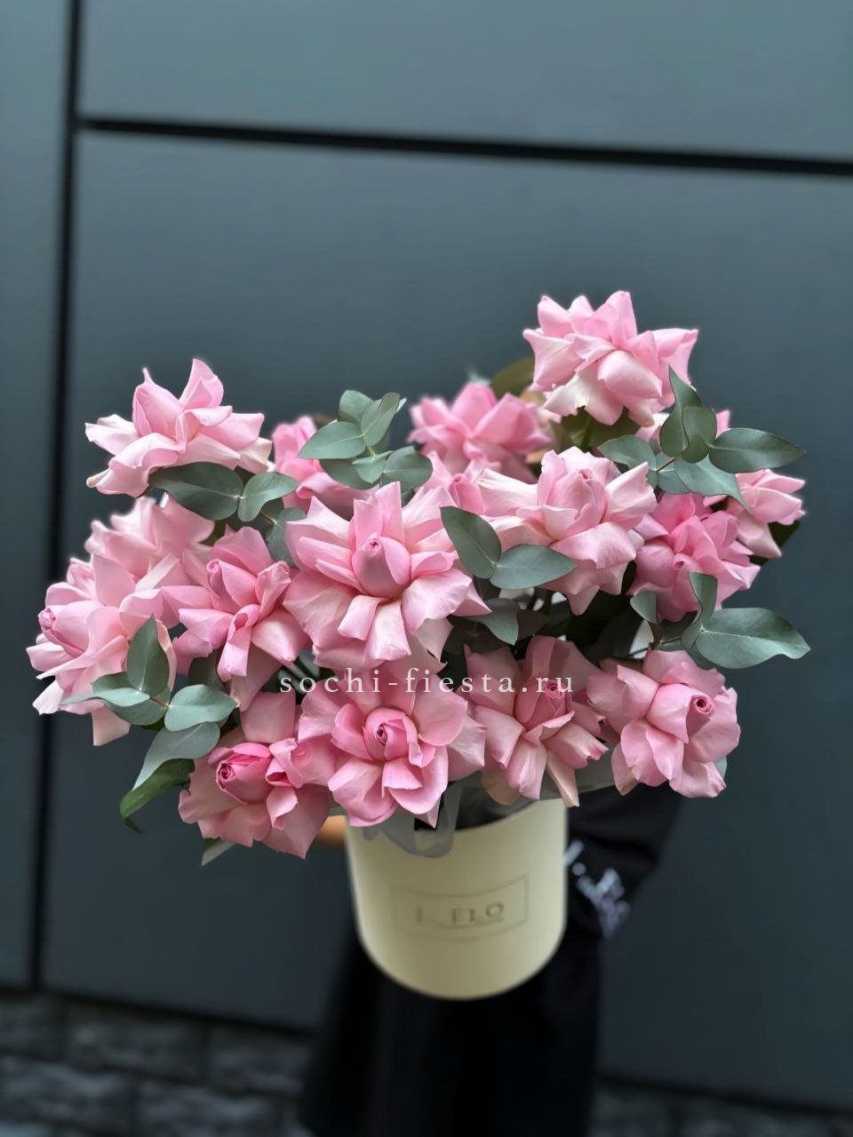 гортензия, кустовые розы, белые розы, эустома, диантусы, озатамус, цилиндр D16, эвкалипт, лента.