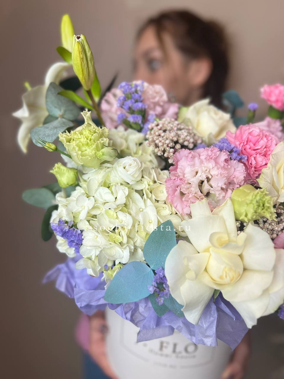 цветочная композиция, выполненная в бежевом цилиндре диаметром 20 см.