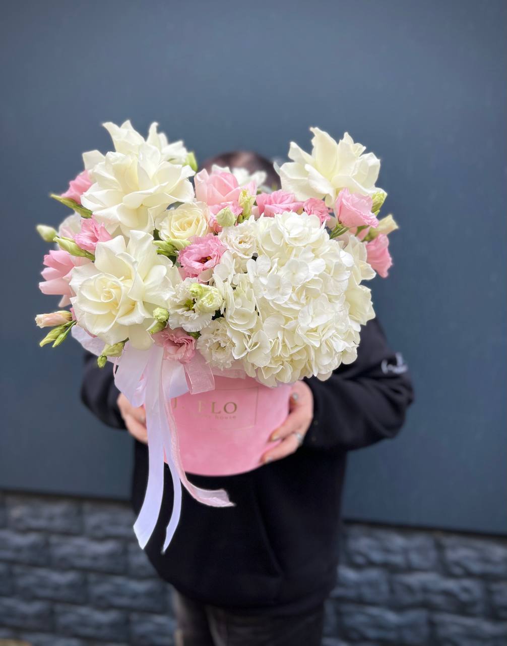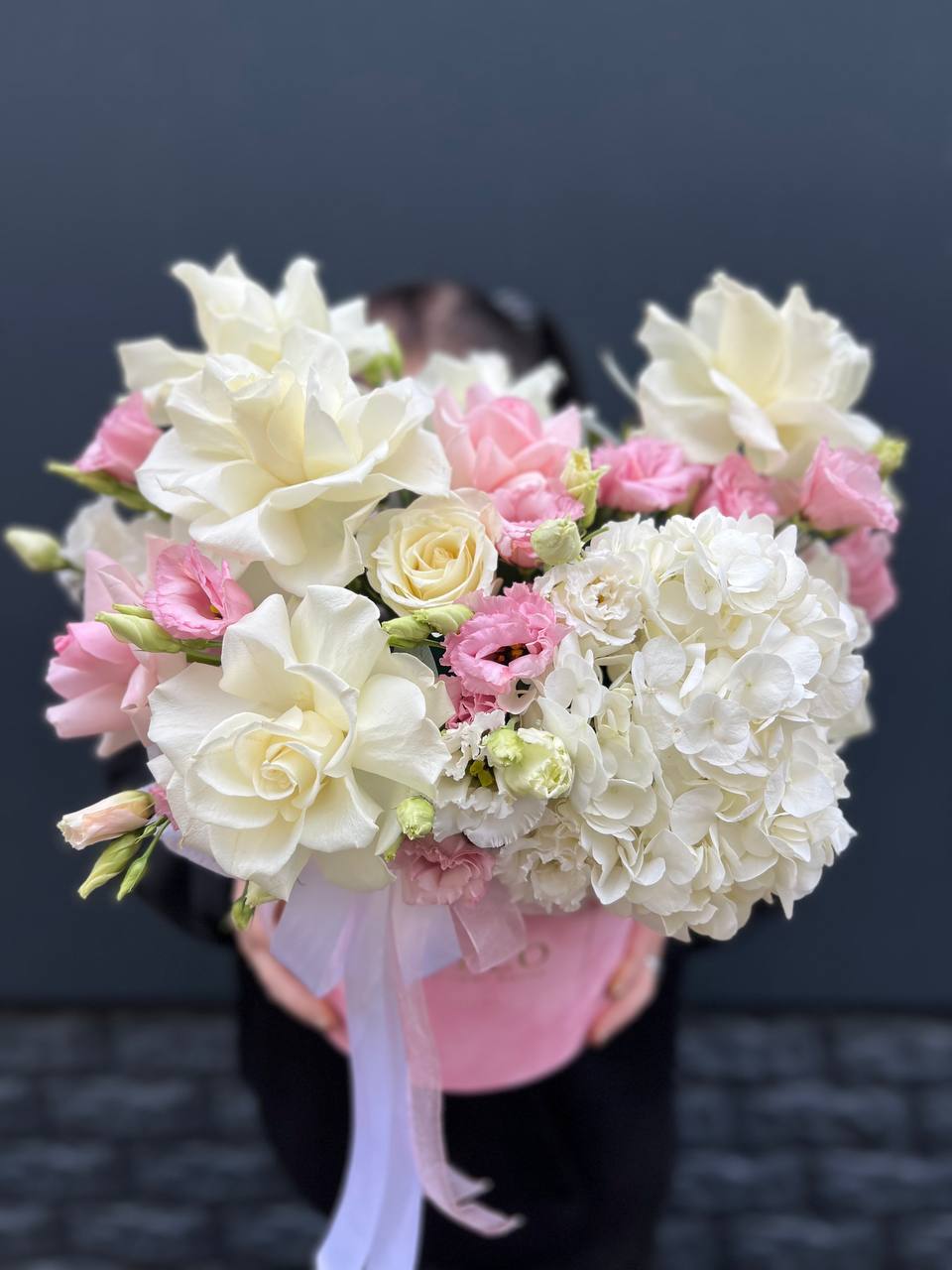 Пышная гортензия сплетается с воздушными кустовыми розами в объёмной шляпной коробке. Мягкие оттенки и многослойная фактура создают ощущение лёгкости и свободы. Композиция занимает пространство уверенно и непринуждённо.