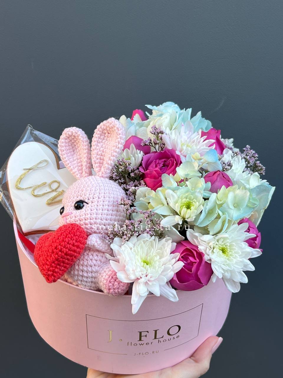 Компактная композиция с хризантемами, гортензией и пионовидной розой дополнена зайкой ручной работы и имбирным пряником. Милый знак внимания в одной коробке.