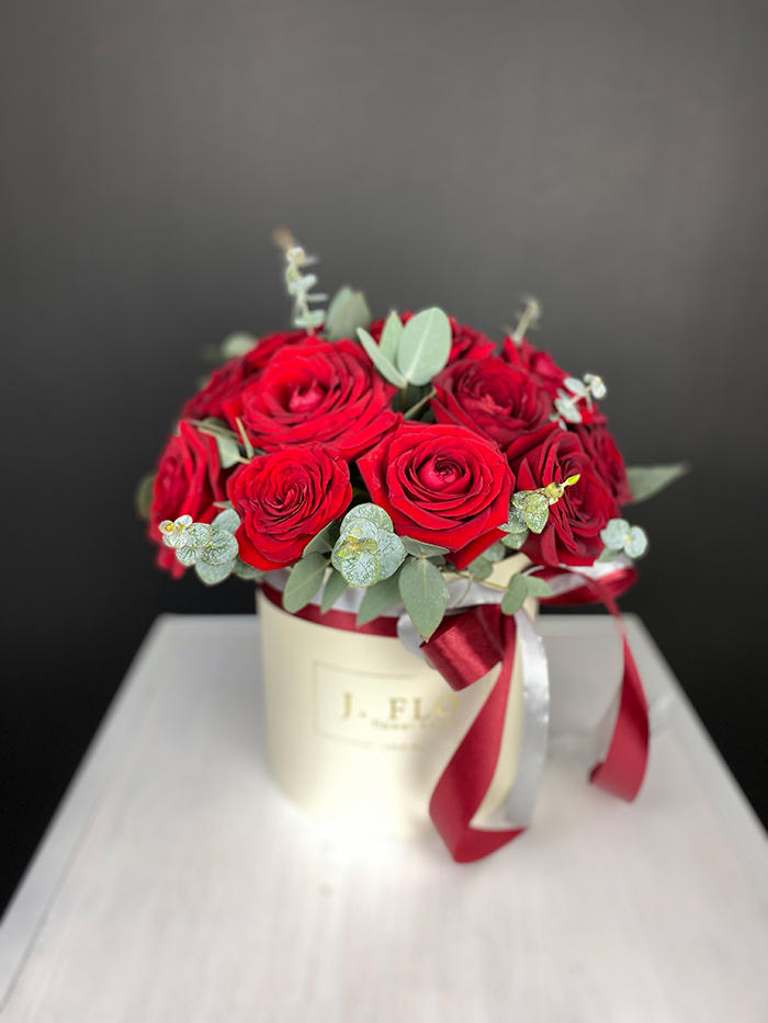 Семнадцать французских роз в пастельном миксе собраны в круглую форму. Композиция компактна и выразительна благодаря сочной зелени эвкалипта.