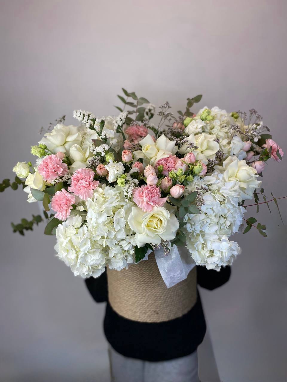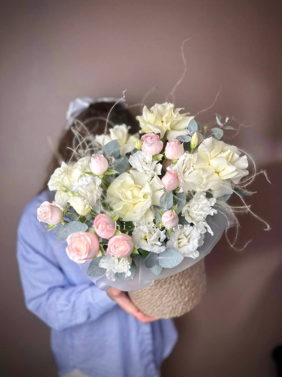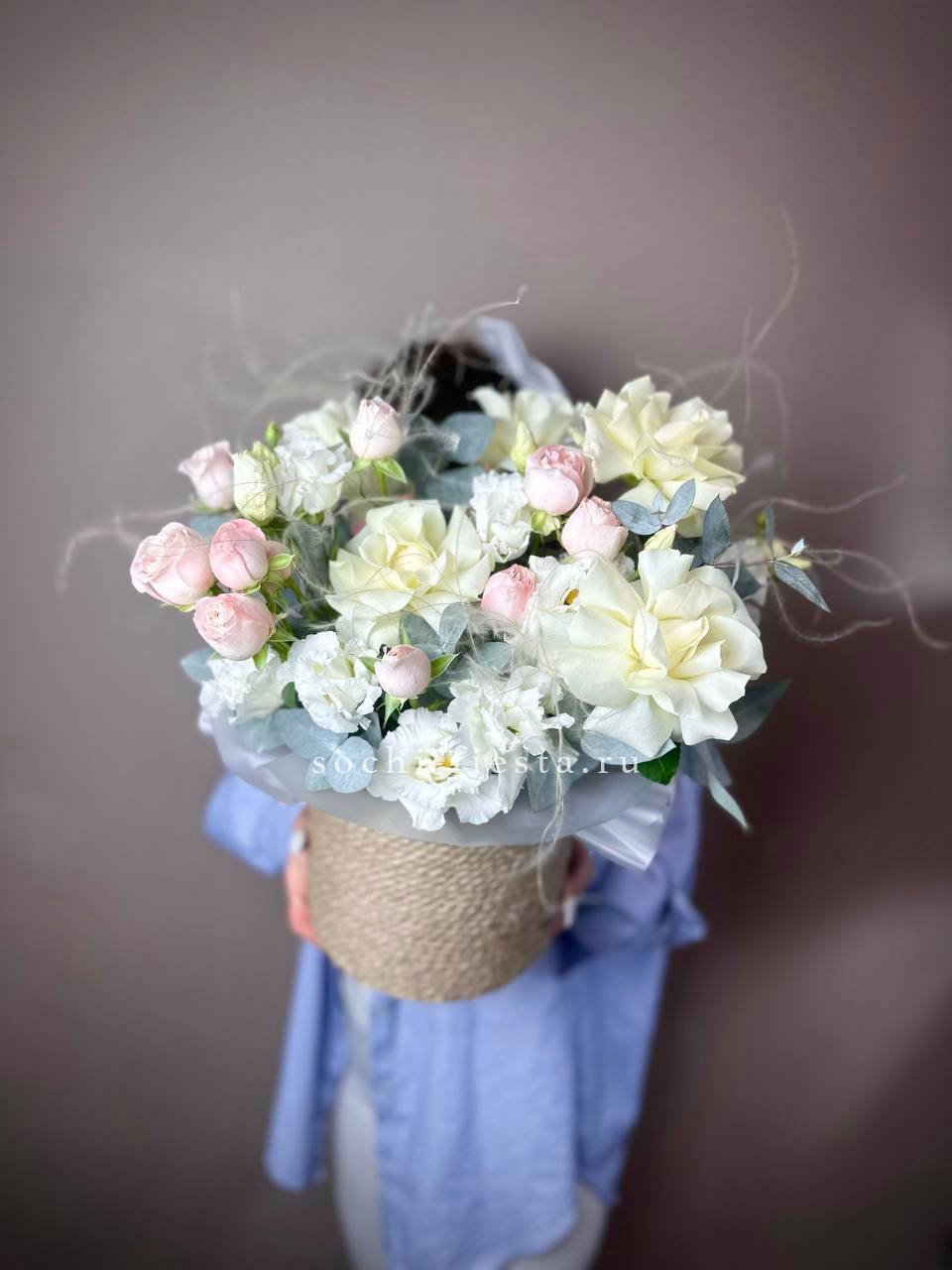 Воздушная композиция в натуральном джутовом кашпо с белыми розами и эустомой. Диантусы добавляют объема и делают форму округлой. Готовое решение для размещения на столе или комоде.