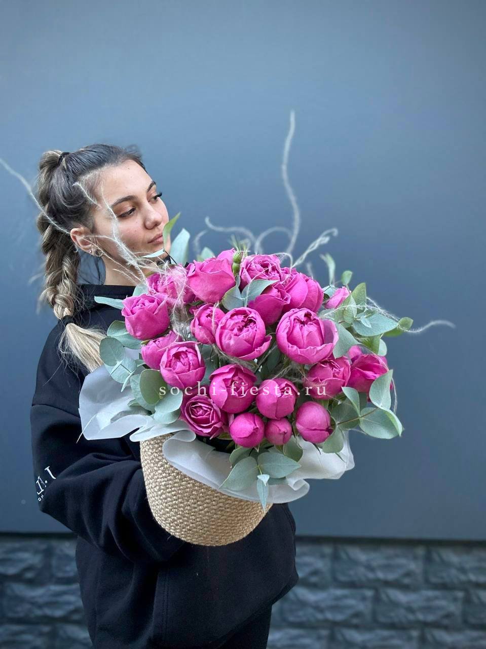 Пионовидные розы Мисти Бабблс в джутовом кашпо