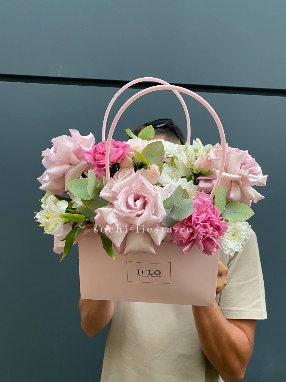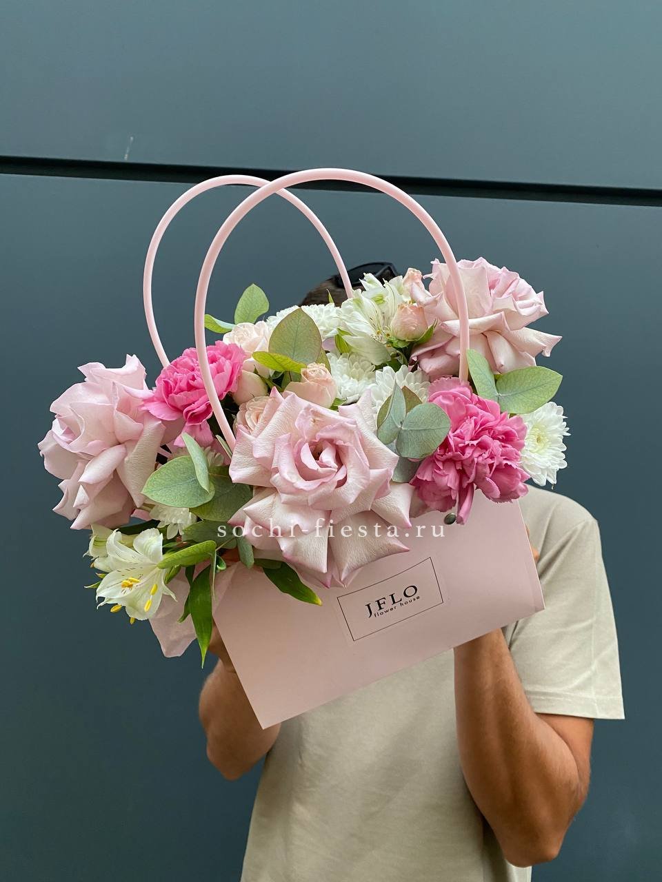 герберы, диантусы, альстромерии,  лента, эвкалипт,  сумка-кашпо.