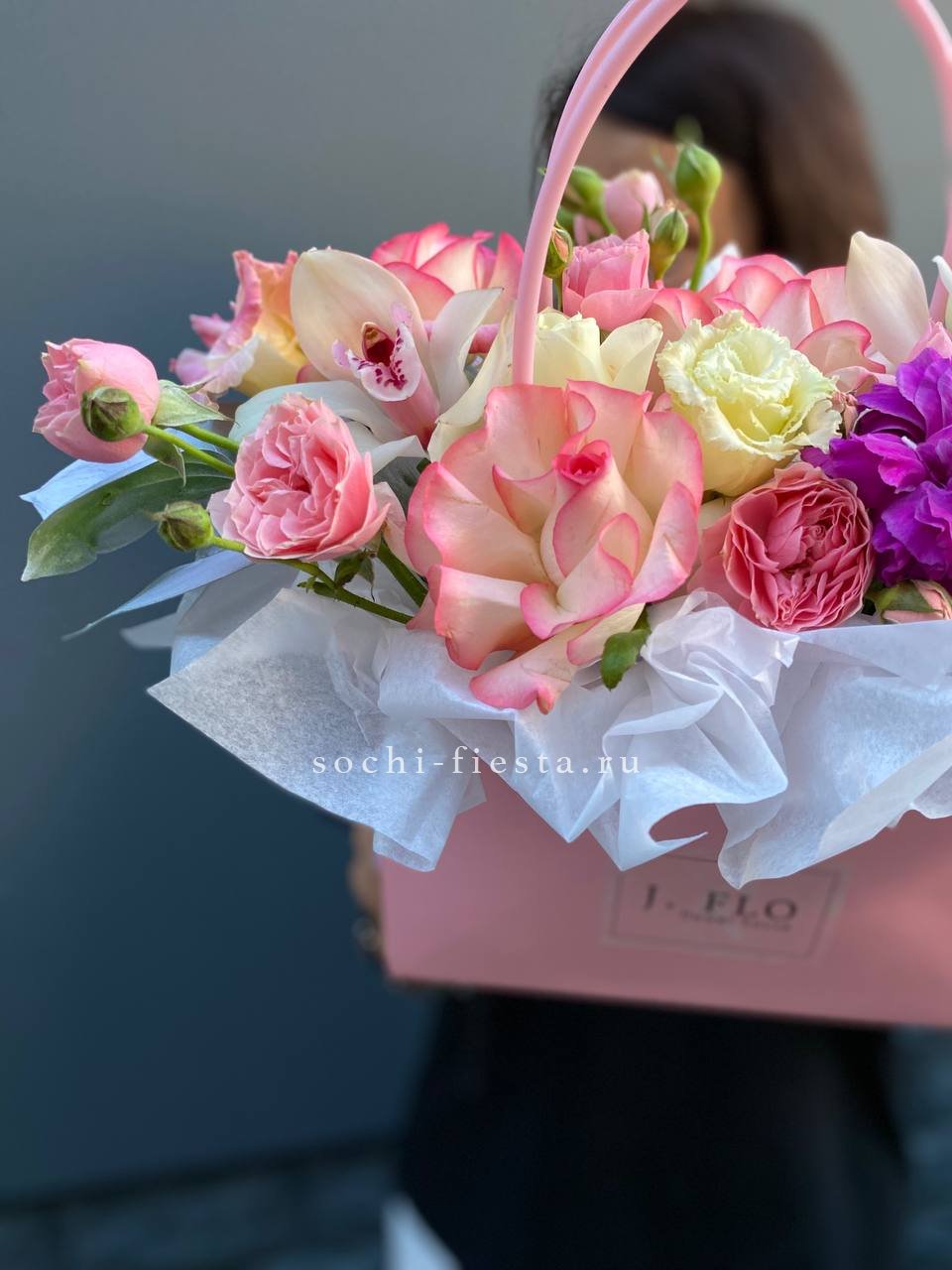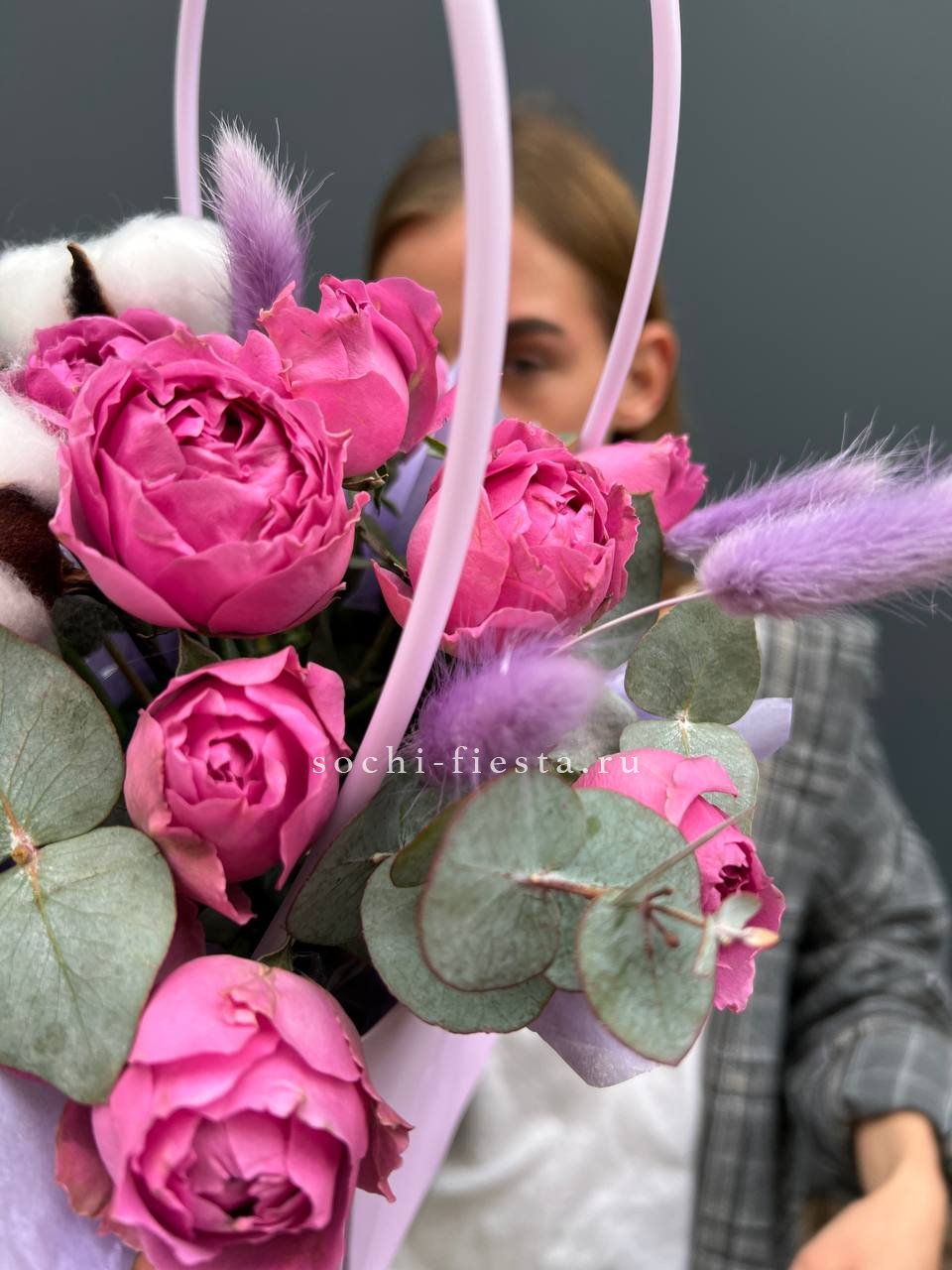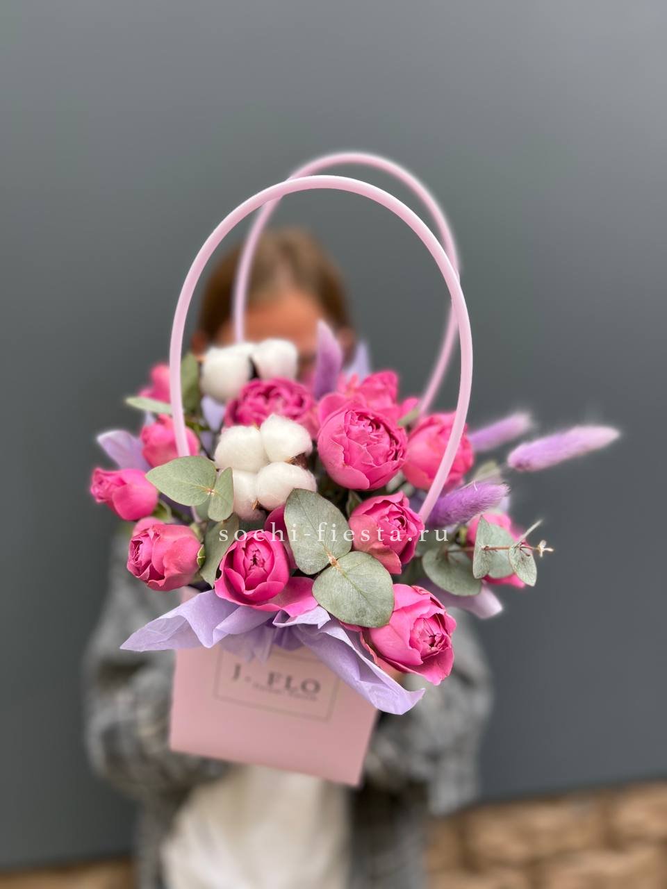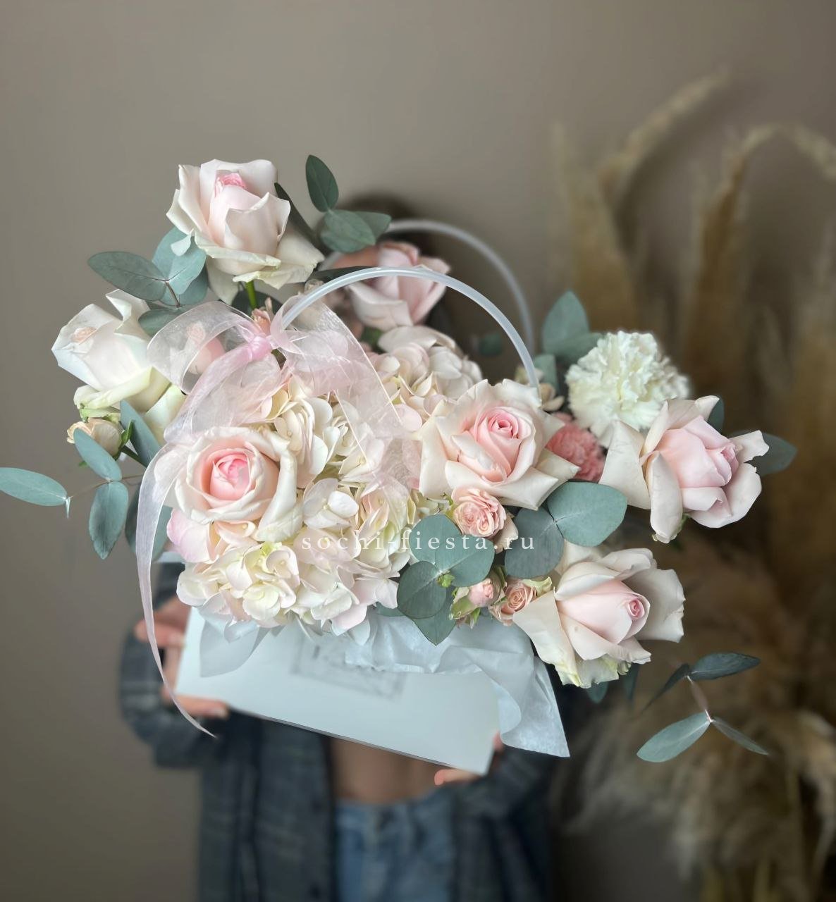 Пышные головки пионовидных роз задают объём, а мелкие соцветия диантуса разбивают плотность. Гортензия добавляет воздушную текстуру, эвкалипт смягчает линии. Композиция в сумке-кашпо выглядит свободно и живо.