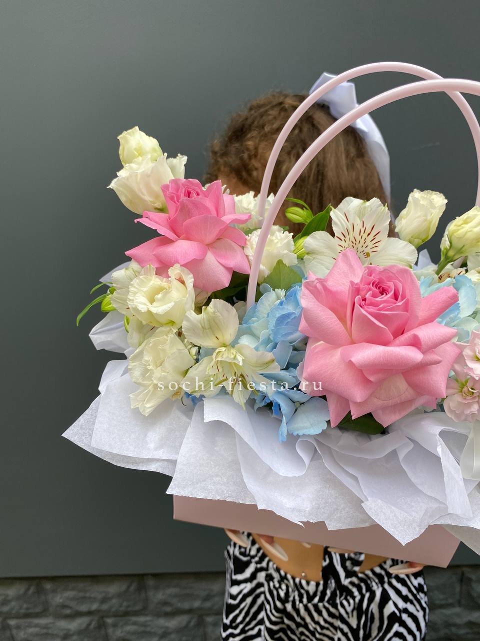 Альстромерии и эустомы создают воздушную текстуру, а розовые розы добавляют композиции яркости. Сумка-кашпо делает презентацию удобной и готовой к вручению без дополнительных хлопот.
