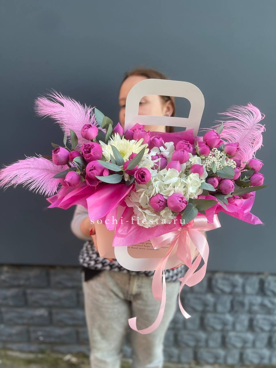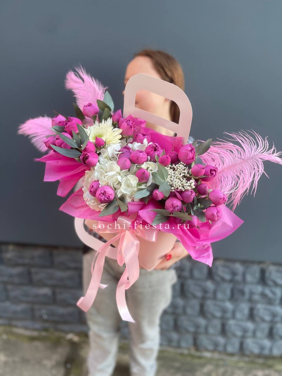 Пионовидные розы Мисти Бабблс раскрываются пышными головками среди диантусов и хлопка. Белые розы создают светлые паузы в композиции. Сумка-кашпо делает подачу мобильной и завершенной.
