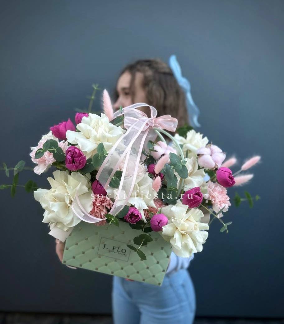 Сумочка Florence дарит ощущение солнечного утра. Альстромерии и розовые розы собраны в легкую композицию с добавлением хлопка и диантусов. Удобная форма позволяет разместить её на столе или подоконнике.