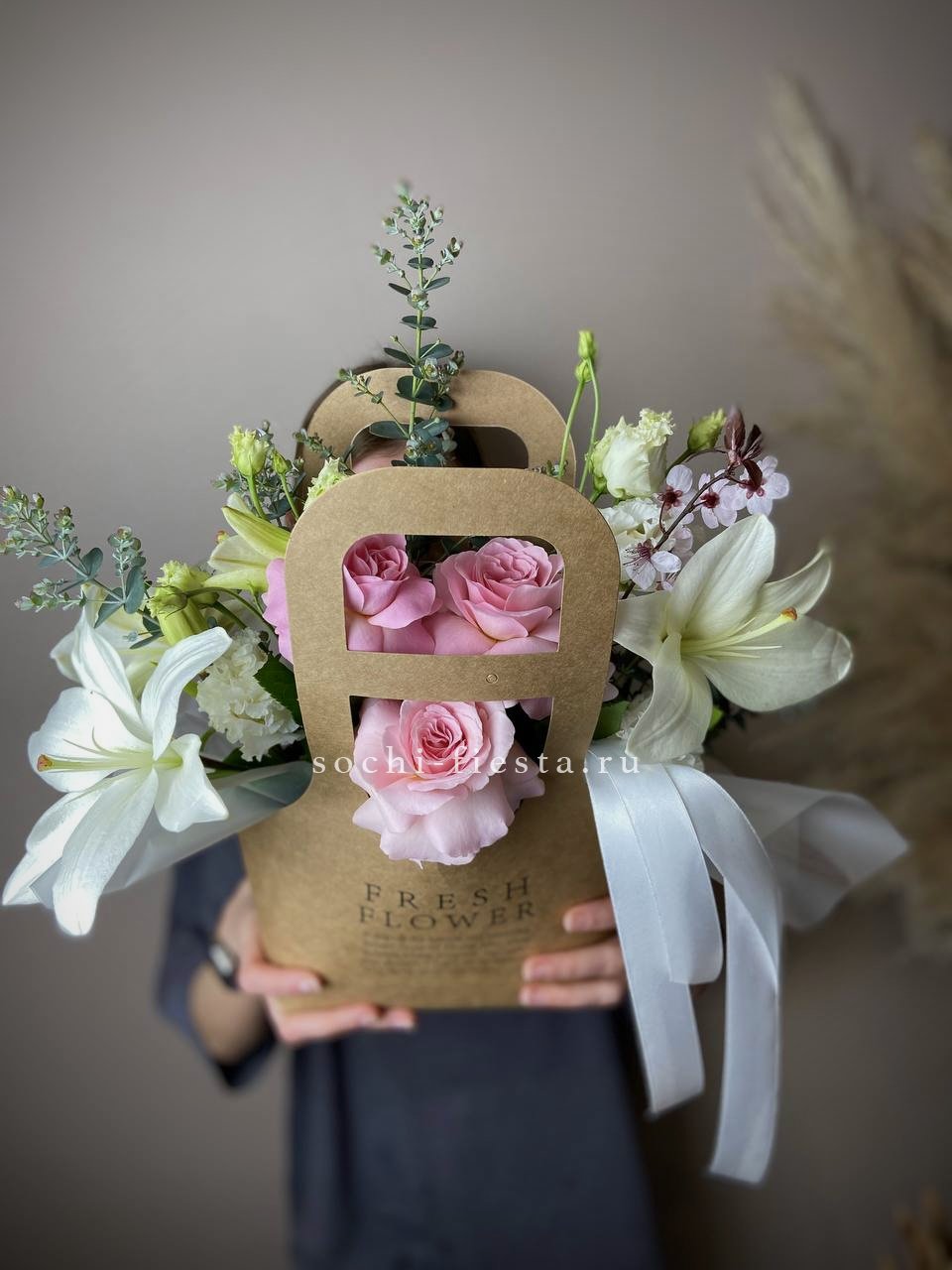 альстромерии (в зависимости от сезона, возможна замена), розовые розы, хлопок, диантусы, лента, сумка-кашпо.