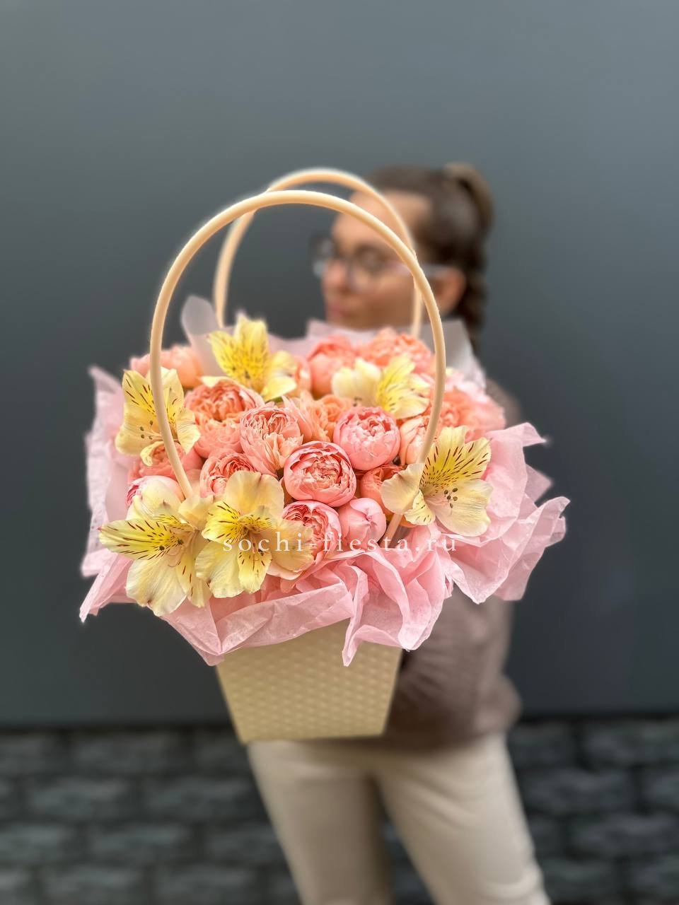 Пионовидные розы Джульетта и яркие альстромерии собраны в компактную сумочку с лентой. Округлые бутоны создают мягкий объем, а формат позволяет разместить композицию на столе или полке.