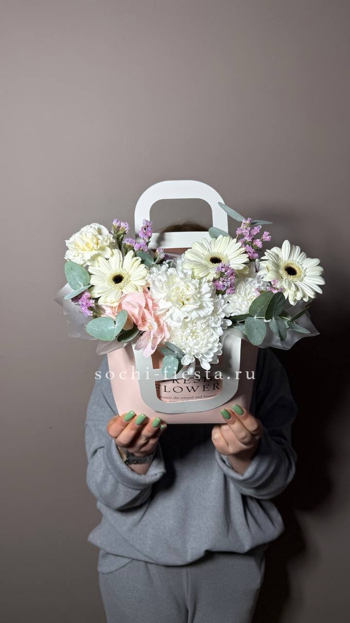 гербера, хризантема, диантус, статица, гортензия, сумочка.