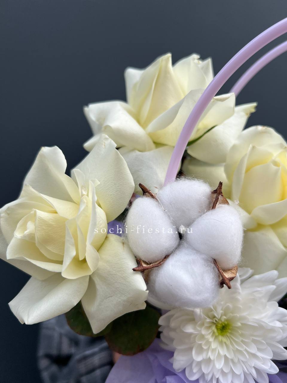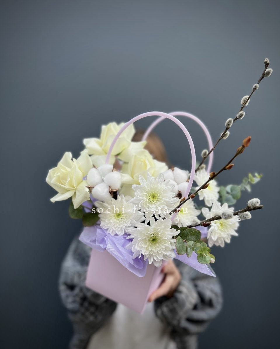 Хризантемы с пушистыми коробочками хлопка создают теплую домашнюю композицию в удобной сумочке. Цветы долго радуют взгляд и не требуют сложного ухода. Формат подходит для размещения в любом уголке дома.