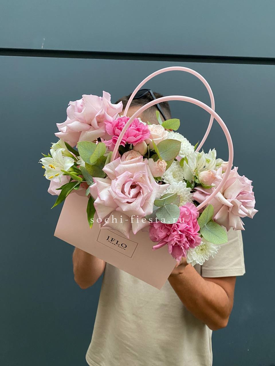 Розовые розы и диантусы переплетаются с кустовыми хризантемами в плотной округлой композиции. Альстромерия добавляет графичные акценты между бутонами. Сумочка собирает все элементы в аккуратную форму с естественным объёмом.