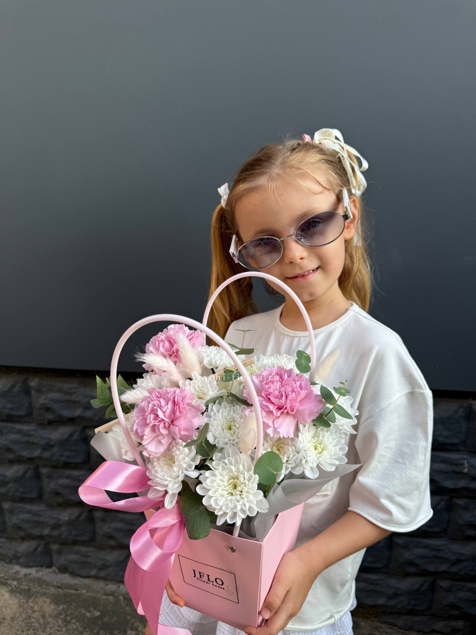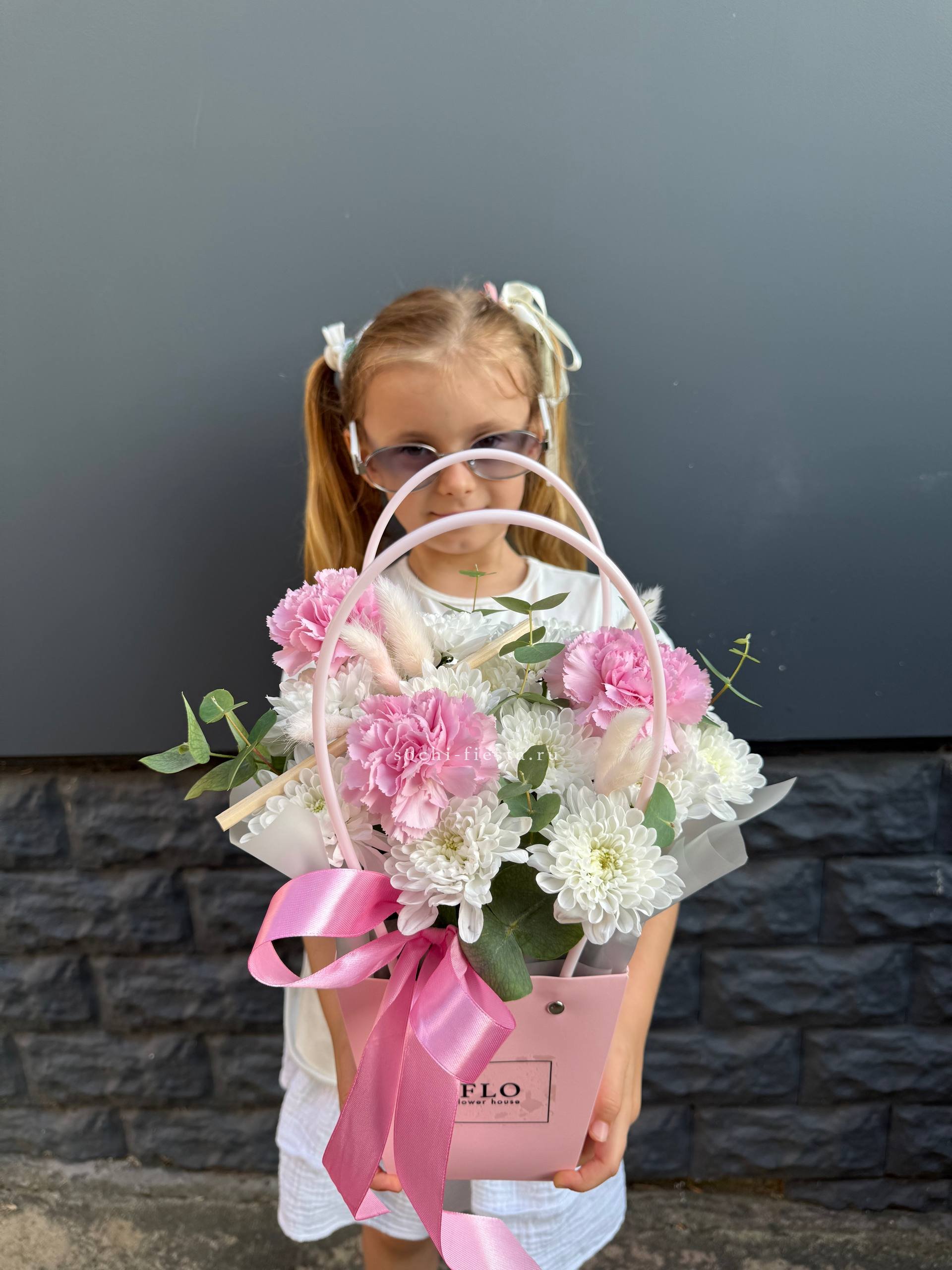 Розовые оттенки переплетаются с солнечными пушистыми шариками мимозы и белоснежным хлопком. Весенняя композиция в удобной сумочке дарит ощущение первых теплых дней и пробуждения природы.
