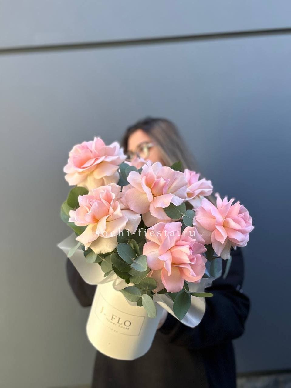 Пудровые оттенки роз и эустомы образуют мягкую цветовую гамму в компактной коробке. Шесть макаронс дополняют композицию и создают завершённый образ. Решение для корпоративного поздравления в спокойной палитре.