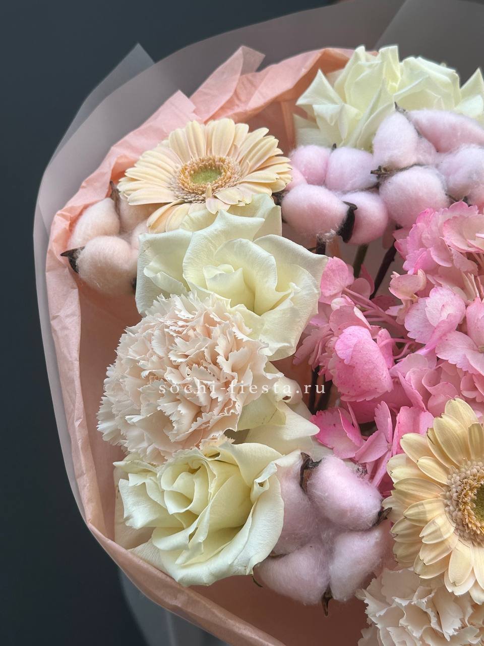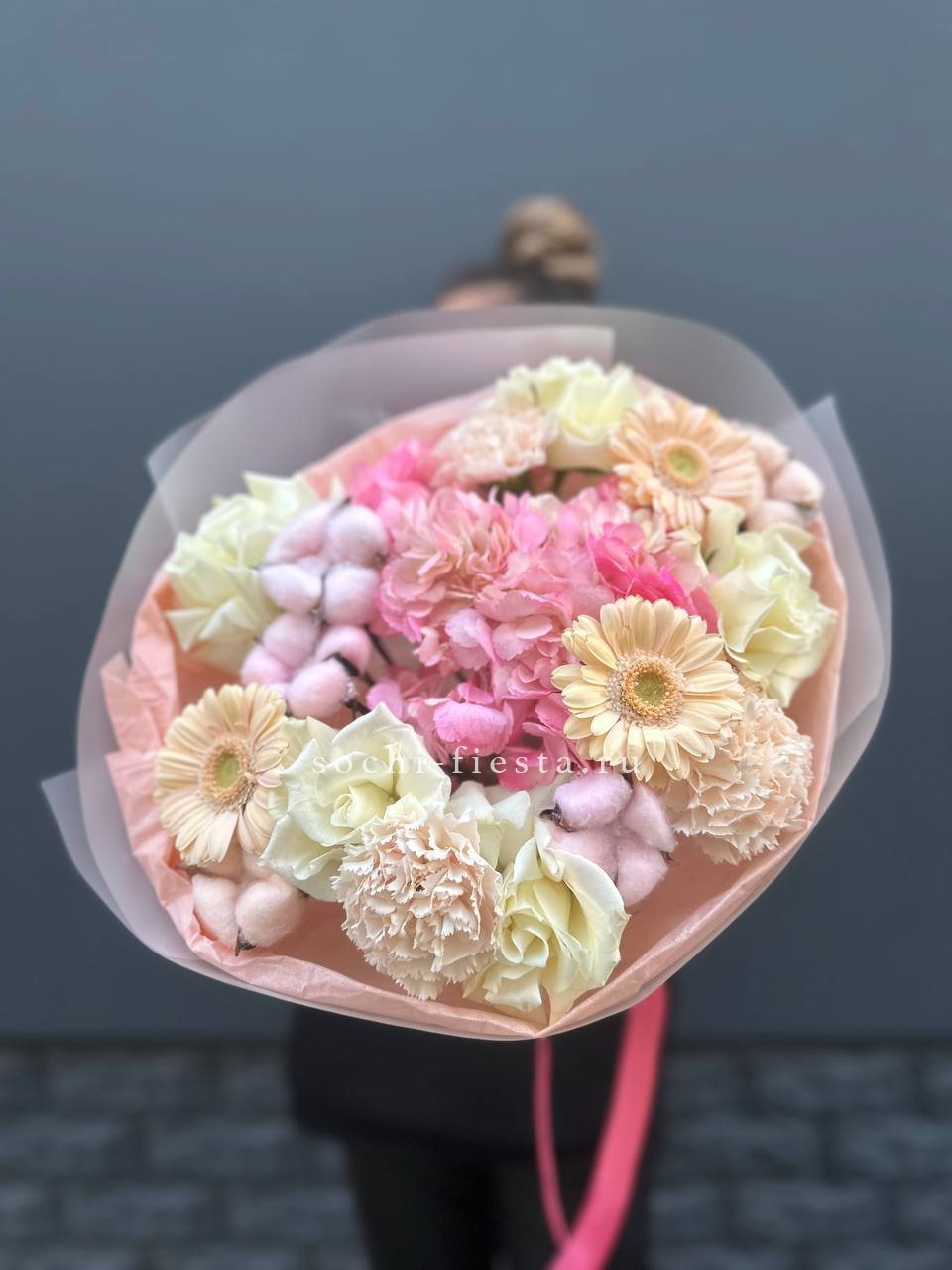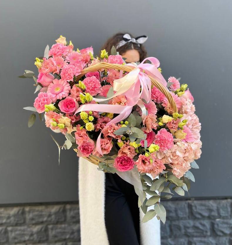 гортензия, диантус, розовая роза, эустома, гербера, корзина средняя, наполнение.