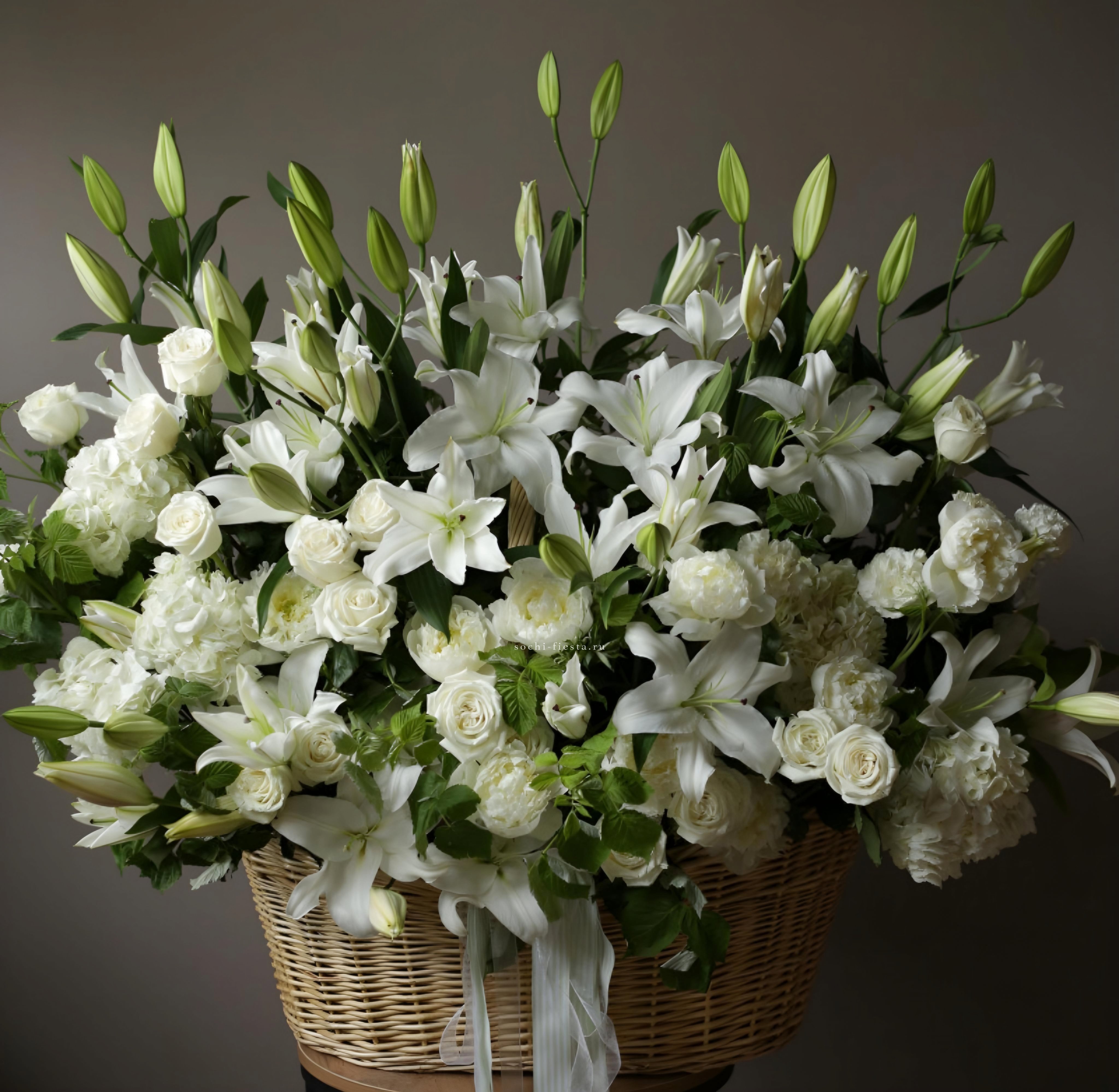 Триста одна белая роза в плетёной корзине образует живую скульптуру почти метровой высоты. Монохромная композиция завораживает масштабом и графичностью.