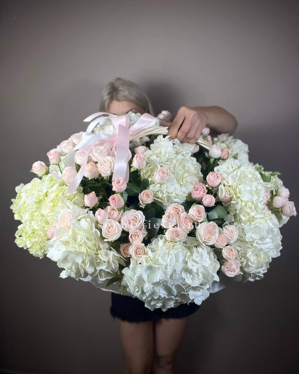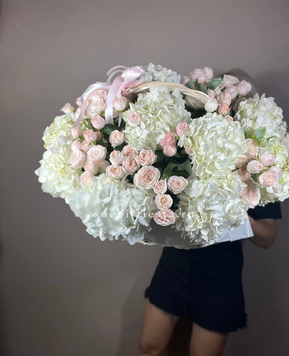 гортензия, эустома, розы, маттиола (дельфиниум или аналоги), кустовые розы, лента, корзина D40