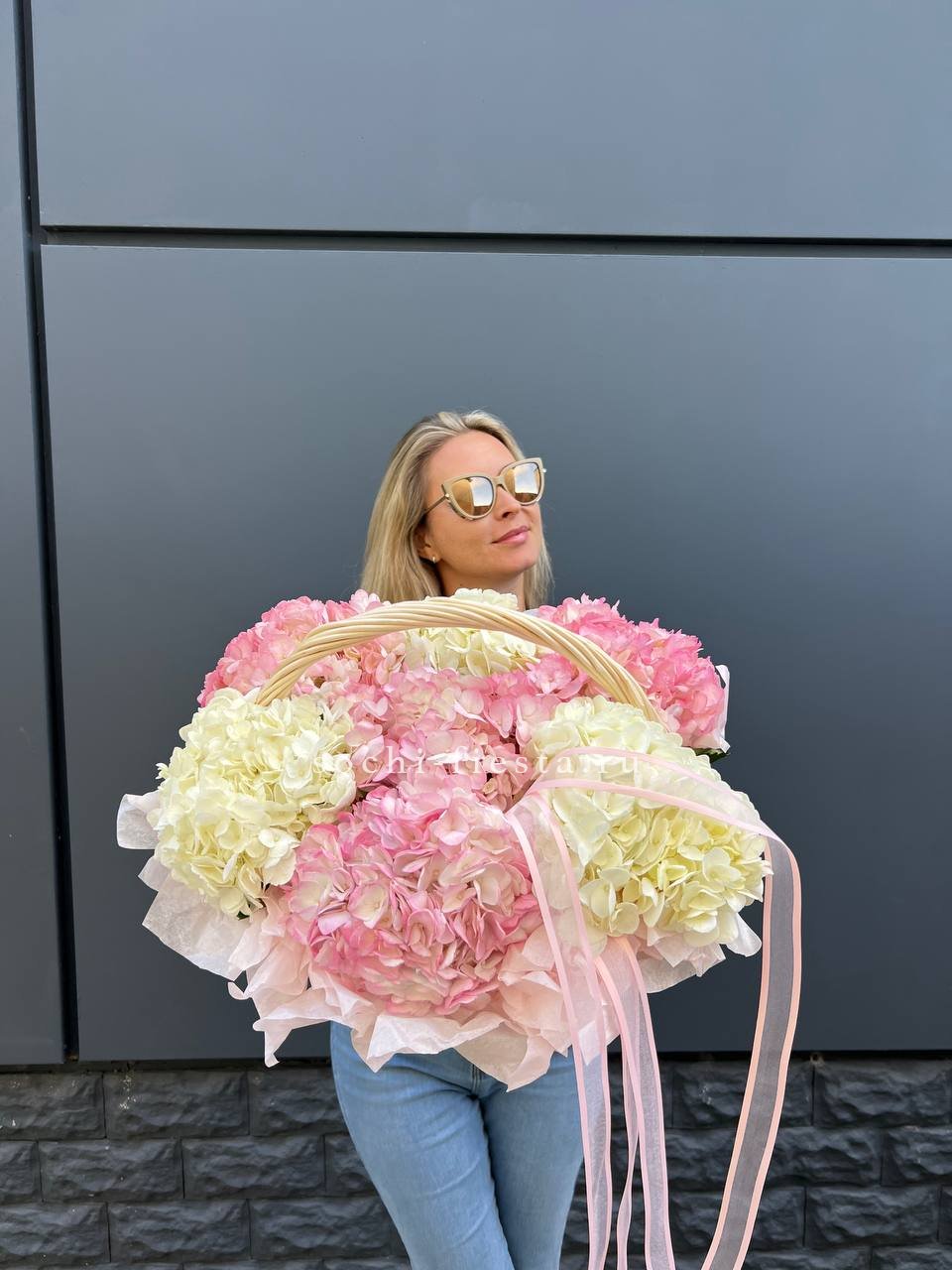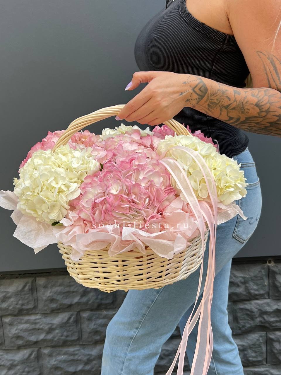Плотная россыпь бутонов в плетеной корзине создает живописную композицию с переходами от сиреневых до пудровых оттенков. Гортензия и маттиола задают воздушный объем, а розы разной раскрытости добавляют глубину и многослойность всей картине.